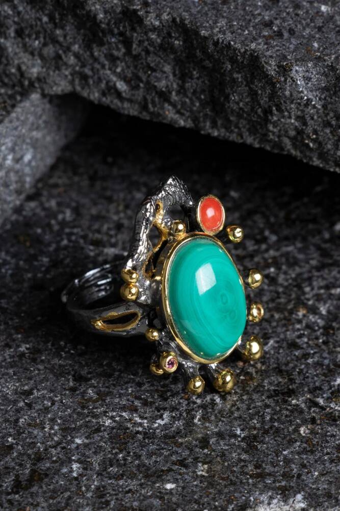 Sertifikalı İridyumlu Malahit, Mercan Özel Tasarım Gümüş Yüzük (Kadın) (SK:002) - 1