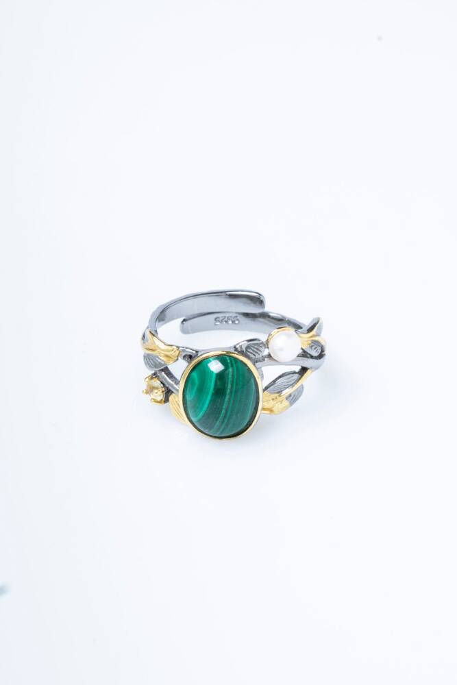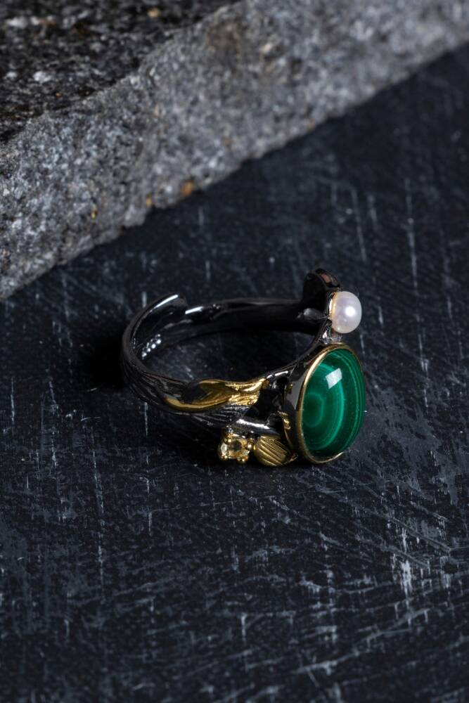 Canlı Desenler ve Zarafet: Malahit'in kendine has canlı yeşil katmanlı desenleri, yüzüğe sanatsal ve hipnotize edici bir güzellik katar.