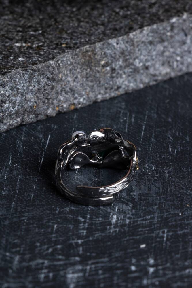 Bu yüzük, orijinalliği ve kalitesi onaylanmış Sertifikalı Malahit taşı kullanılarak üretilmiştir. Taşın canlı desenleri, İridyumlu Gümüş detaylarla birleşerek göz alıcı ve asil bir estetik sunar.