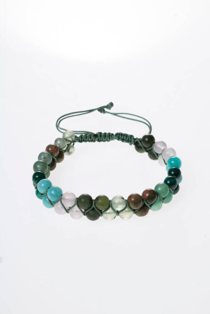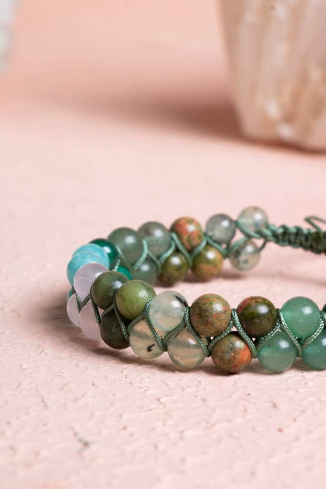 Bileklik, kalp çakrasını açarak koşulsuz sevgiyi, huzuru ve uyumu destekleyen %100 doğal ve sertifikalı Yeşim, Pembe Kuvars, Amazonit, Malahit, Yeşil Aventurin, Unakit ve Prehnit (6mm) taşları ile elde örüldü. Bu taşların birleşimi, kendinize ve başkalarına karşı daha sevgi dolu ve şefkatli olmanıza yardımcı olur.