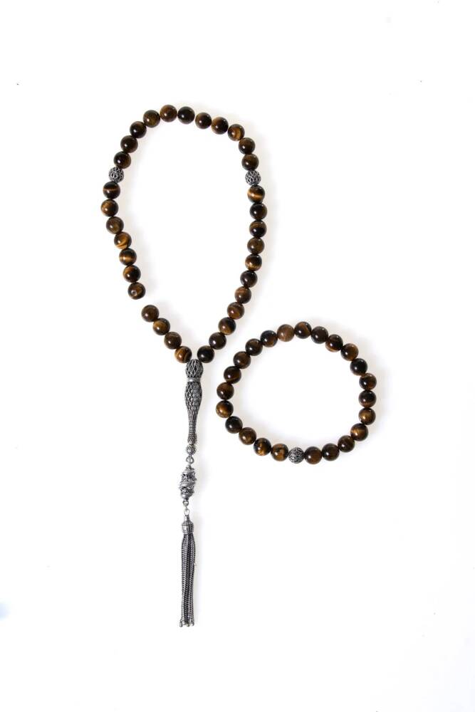 Sertifikalı Kaplan Gözü 925 Ayar Gümüş 8 mm İmameli Tesbih & Bileklik Seti
