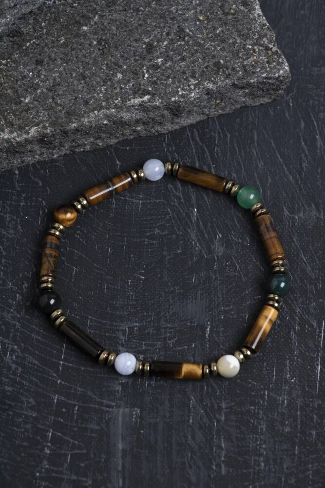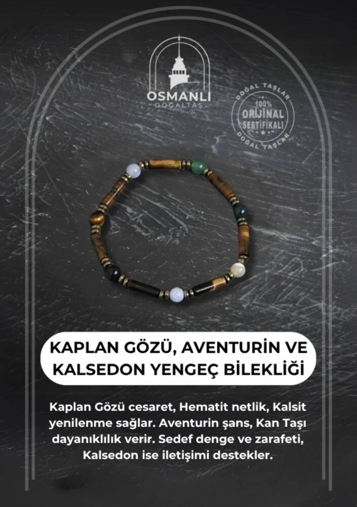 Duygusal zekâsı yüksek ve sezgileri güçlü Yengeç burçları için özel olarak tasarlanan bu bileklik, hem koruma hem de huzur enerjisi sunar. Kaplan Gözü: Cesaret ve denge getirir. Hematit: Negatif enerjiyi emer, zihni netleştirir. Kalsit: Yenilenme ve pozitif düşünceyi teşvik eder. Aventurin: Şans ve iç huzur taşı olarak bilinir. Kan Taşı: Beden-zihin ruh uyumu sağlar, dayanıklılığı artırır. Sedef: Duygusal dengeyi destekler, zarafeti temsil eder. Kalsedon: Sakinleştirici etkisiyle iletişimi güçlendirir. Yengeç burcunun hassas ve şefkatli doğasına uyum sağlayan bu bileklik, sertifikalı orijinal doğal taşlarla hazırlanmıştır. Hem ruhsal destek hem de şık bir tamamlayıcı aksesuar olarak idealdir.