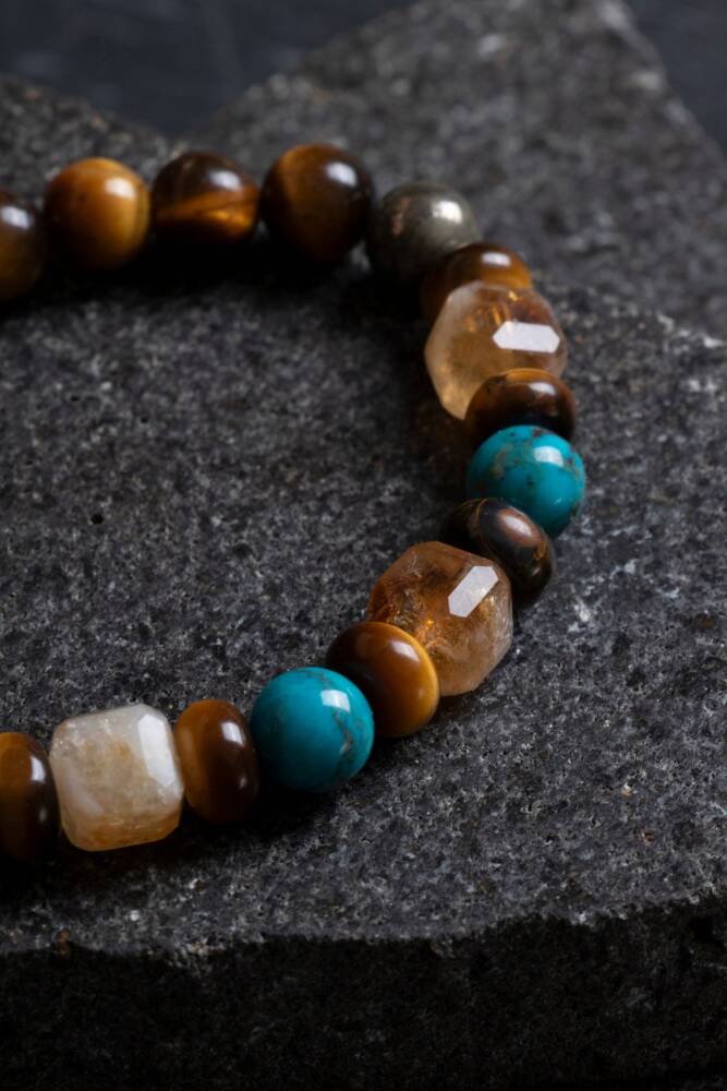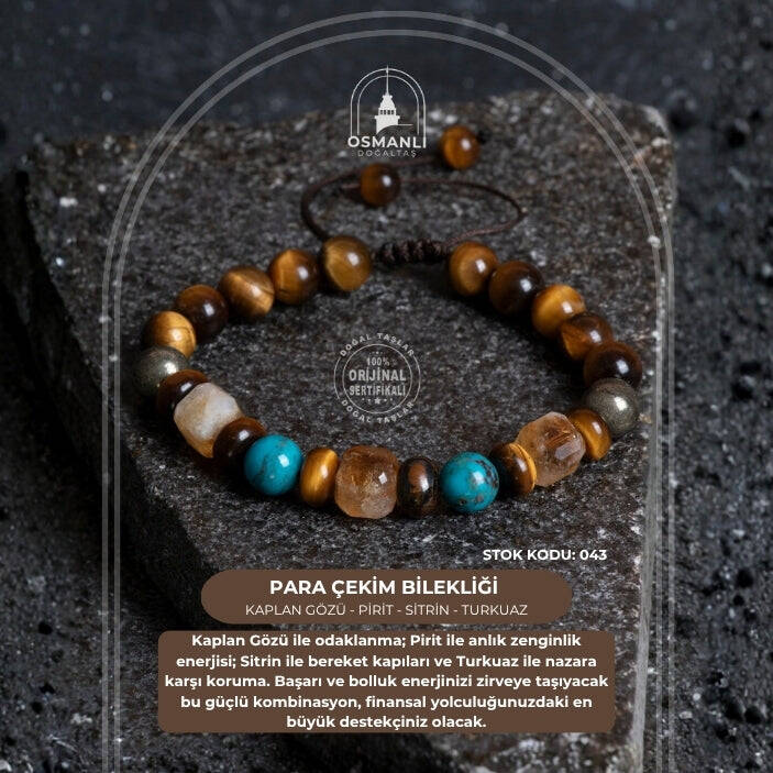 Bu sertifikalı doğal taş bileklik, yaygın inanışlara göre para, şans ve bolluk enerjilerini çekmeye yardımcı olduğu düşünülen Kaplan Gözü, Pirit, Sitrin ve Turkuaz taşlarının özel bir birleşiminden oluşur. Pirit ve Sitrin taşlarının genellikle refah, zenginlik ve ticarette başarı getirdiğine inanılırken, Kaplan Gözü taşı özgüveni, cesareti ve irade gücünü artırarak kişinin hedeflerine odaklanmasına ve başarıya ulaşmasına destek olduğu varsayılır. Turkuaz ise koruyucu özelliği ve dengeleyici enerjisi ile bilinir, genellikle iyi şans ve refah getirdiğine inanılır; dolayısıyla bu dört taşın bir araya gelmesiyle, kullanan kişinin hem maddi hem de manevi alanda pozitif enerji, motivasyon ve koruma elde etmesi hedeflenir.