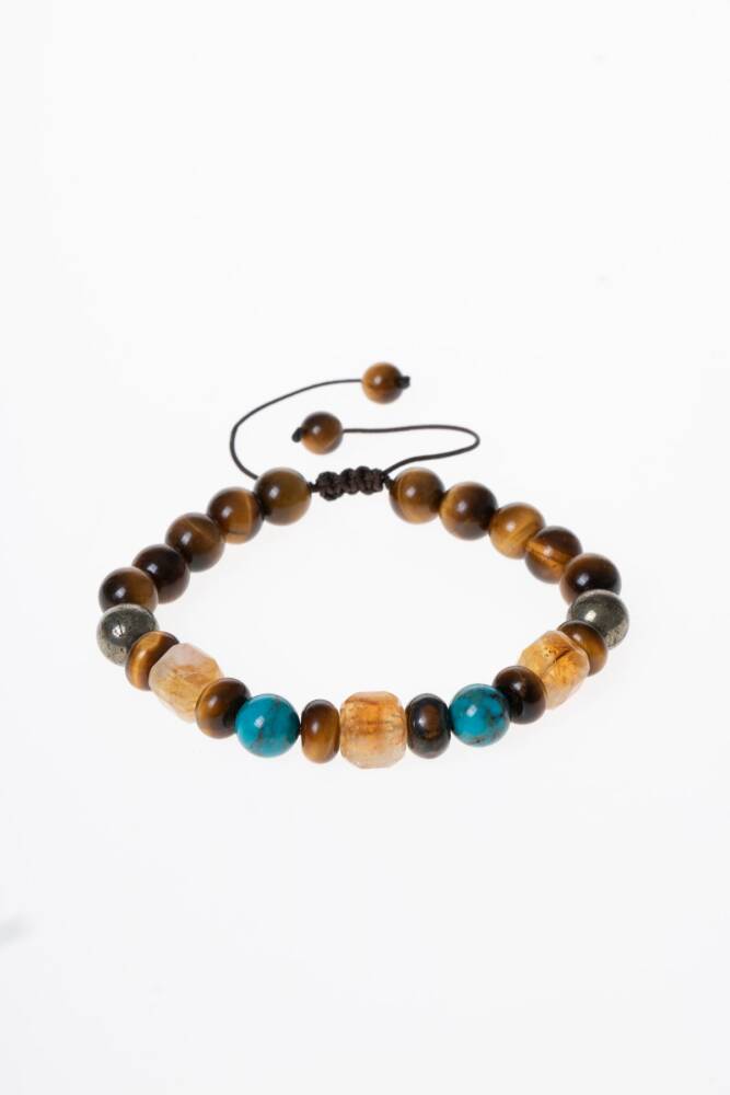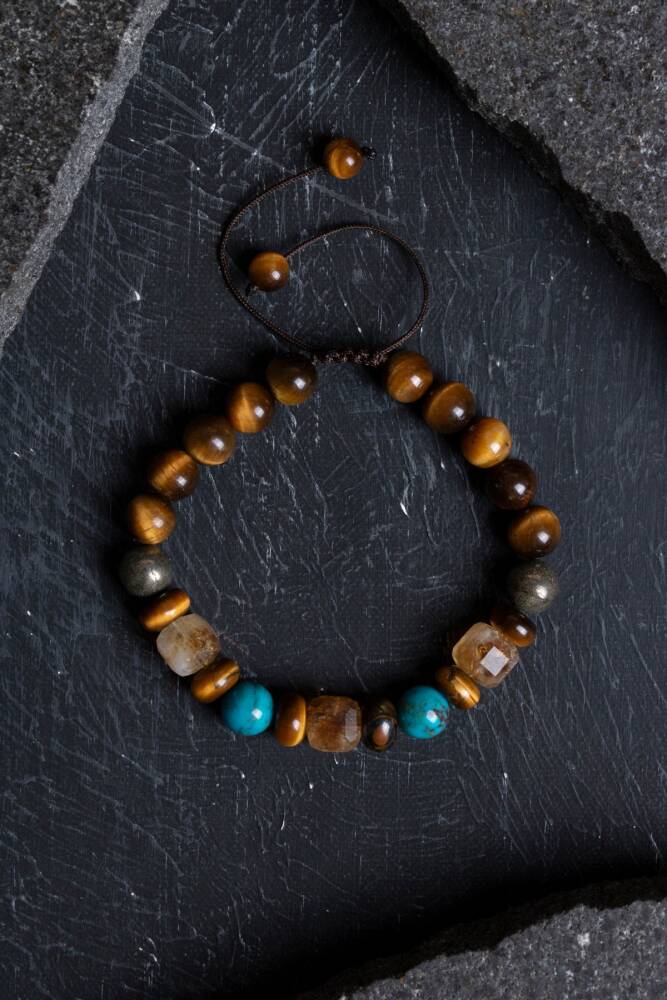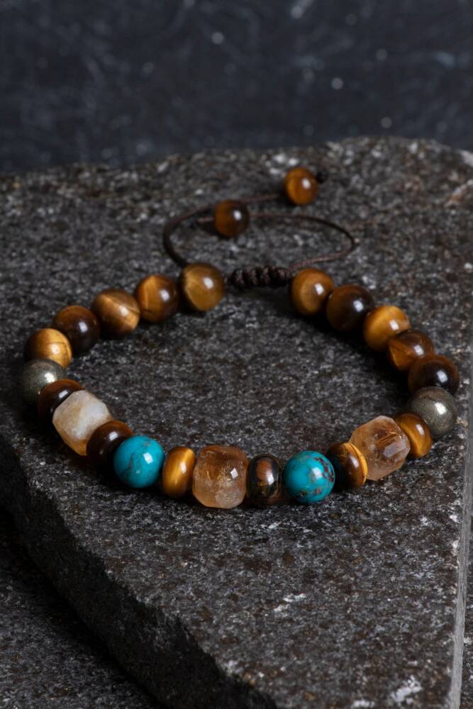 Bu sertifikalı doğal taş bileklik, yaygın inanışlara göre para, şans ve bolluk enerjilerini çekmeye yardımcı olduğu düşünülen Kaplan Gözü, Pirit, Sitrin ve Turkuaz taşlarının özel bir birleşiminden oluşur. Pirit ve Sitrin taşlarının genellikle refah, zenginlik ve ticarette başarı getirdiğine inanılırken, Kaplan Gözü taşı özgüveni, cesareti ve irade gücünü artırarak kişinin hedeflerine odaklanmasına ve başarıya ulaşmasına destek olduğu varsayılır. Turkuaz ise koruyucu özelliği ve dengeleyici enerjisi ile bilinir, genellikle iyi şans ve refah getirdiğine inanılır; dolayısıyla bu dört taşın bir araya gelmesiyle, kullanan kişinin hem maddi hem de manevi alanda pozitif enerji, motivasyon ve koruma elde etmesi hedeflenir.