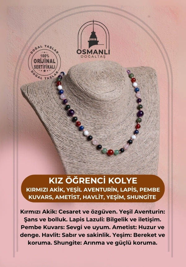 Sertifikalı Kız Öğrenci Kolye, Osmanlı doğal taş geleneğinin zarafetini modern tasarımla buluşturan, hem estetik hem de enerjisel faydalarıyla öne çıkan özel bir aksesuardır. Kırmızı akik, yeşil aventurin, lapis lazuli, pembe kuvars, ametist, havlit, yeşim ve shungite taşlarının bir araya gelmesiyle hazırlanmış bu kolye, şıklığın yanında güçlü bir enerji dengesini de sunar.