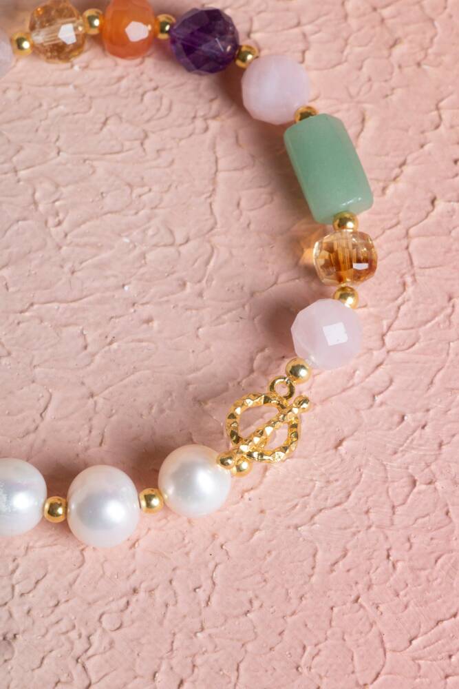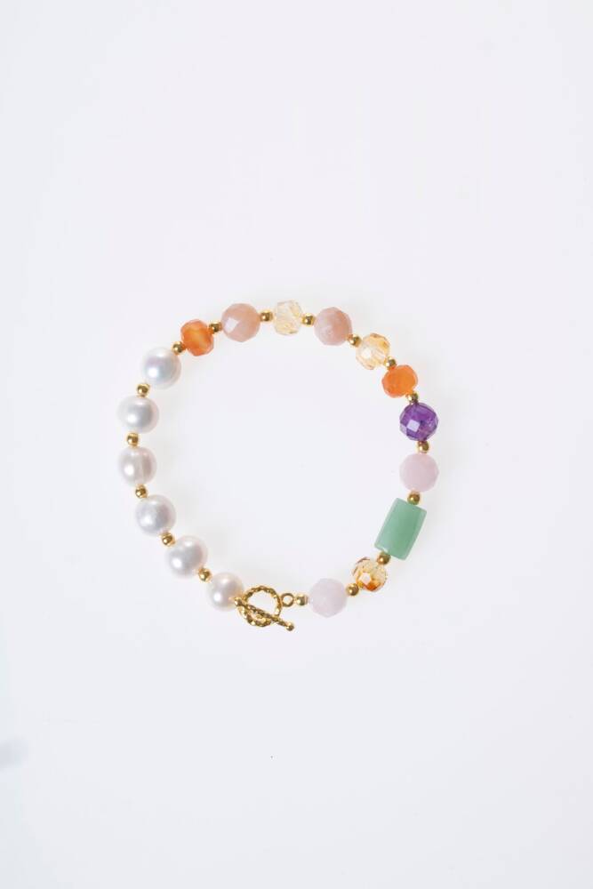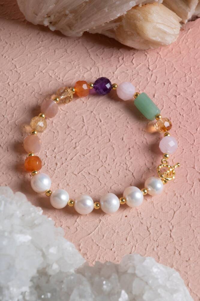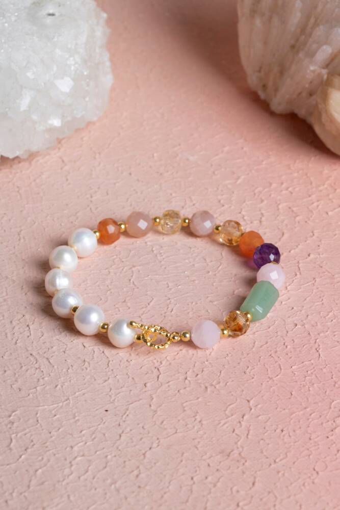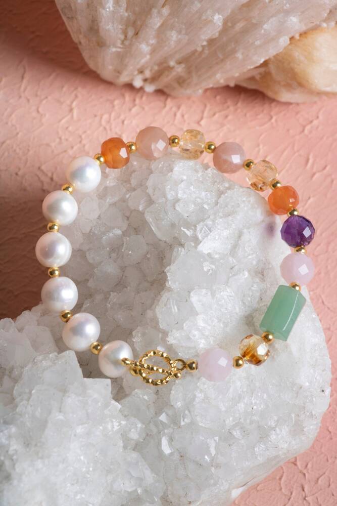 Zodyak'ın ilk burcu olan, cesareti ve enerjisiyle tanınan Koç kadınları için özel olarak tasarlanan bu bileklik; İnci, Sitrin, Ametist, Pembe Kuvars, Güneş Taşı ve Aventurin taşlarını 925 ayar gümüş kapama kalitesiyle bir araya getiriyor.