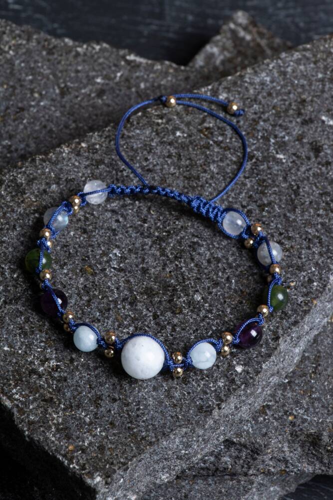 Bu güçlü taşların birleşimiyle oluşturulan bileklik, %100 doğal ve sertifikalı taşlarla, el işçiliğiyle örülmüş makrome tasarım ile hazırlanmıştır. Hem enerjisel hem estetik açıdan Kova burcunun özgün karakterine hitap eder.