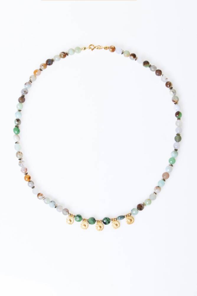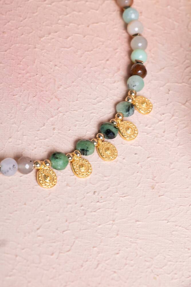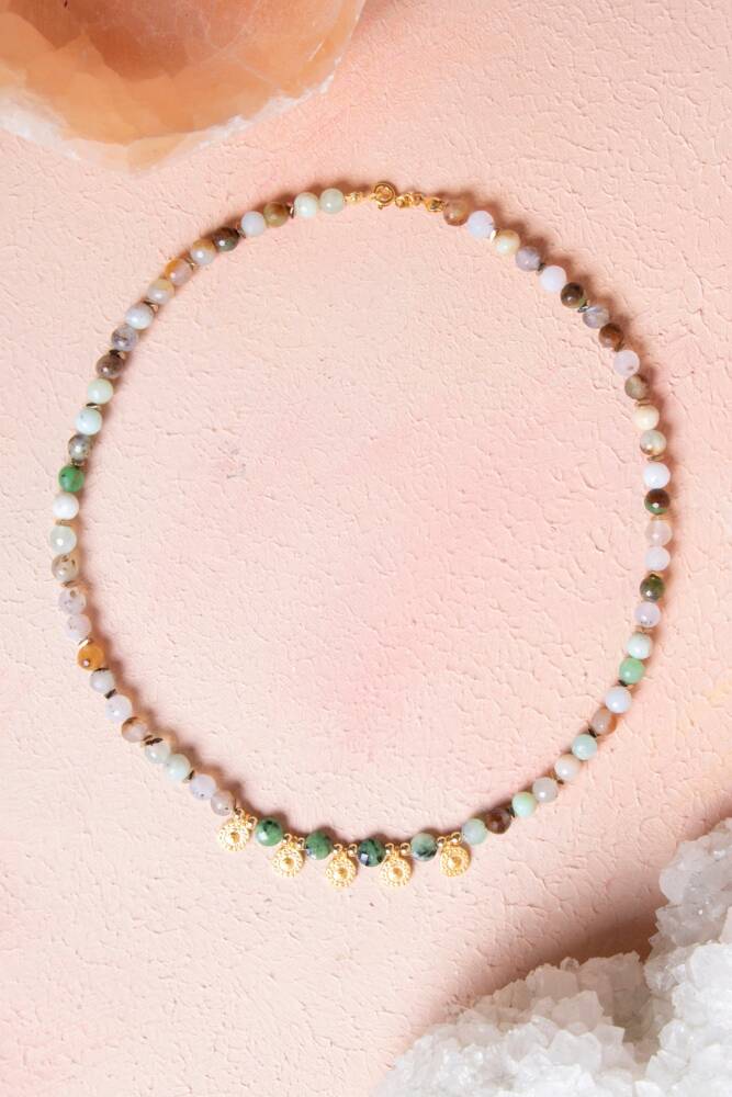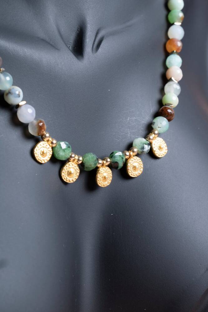 Krizopras, Anyolit & Hematit Doğal Taş Kolye Kalbinizin sesini duyun, doğanın canlılığını ve toprağın gücünü boynunuzda hissedin! Doğanın en özel yeşil tonlarını barındıran Krizopras ve Anyolit, metalik ışıltısıyla denge kuran Hematit ile bu eşsiz tasarımda bir araya geldi. Bu kolye, bir yandan ruhsal gelişiminizi desteklerken diğer yandan modern ve güçlü bir stil sergilemenizi sağlayan özel bir mücevherdir. Üçlü Enerji: Sevgi, Tutku ve Korunma Krizopras (İyimserlik ve Şans): 'Zafer Taşı' olarak da bilinen bu nadide taş, neşe ve umut aşılar. Kalp çakrasını açarak duygusal iyileşmeyi destekler ve kişiye bolluk enerjisi çeker. Anyolit - Yakutlu Zoisit (Tutku ve Vitalite): Yeşil Zoisit içindeki Yakut kristallerinden oluşan bu taş, bireysel gelişimi ve yaratıcılığı simgeler. Kalp ve kök çakrayı birleştirerek hayallerinizi gerçekleştirmek için gereken enerjiyi verir. Hematit (Denge ve Korunma): Metalik gri parıltısıyla bilinen bu taş, negatif enerjiyi emer ve zihni berraklaştırır. Diğer taşların yüksek enerjisini topraklayarak size odaklanma ve güç sağlar. Tasarım ve Malzeme Özellikleri A Kalite Seçkin Taşlar: En canlı yeşillere sahip Krizopraslar, karakterli dokusuyla Anyolitler ve kusursuz yansımalı Hematit taşları kullanılmıştır. Zengin Renk Paleti: Doğanın yeşil tonları ile Hematit'in metalik grisi arasındaki kontrast, her kıyafete derinlik katan sofistike bir görünüm oluşturur. Kaliteli Detaylar: Ciltle dost, uzun ömürlü kullanım sunan ve taşların doğal güzelliğini gölgelemeyen dayanıklı aparatlar tercih edilmiştir. Güçlü ve Zarif: Boynunuzda taşıdığınızda size hem özgüven hem de huzur veren, dengeli bir yapıya sahiptir. Neden Bu Kolyeyi Seçmelisiniz? Duygusal ve Fiziksel Denge: Kendinizi yorgun veya kararsız hissettiğiniz anlarda, doğanın canlandırıcı enerjisiyle tazelenmenize yardımcı olur. Karakter Sahibi Bir Tarz: Sıradan takılardan sıkılanlar için, her biri doğanın birer sanat eseri olan taşlarla fark yaratan bir seçimdir. Kıymetli Bir Niyet Hediyesi: Sevdiklerine 'güçlü kal, kalbinin peşinden git' demenin ve onlara doğanın şifasını sunmanın en estetik yolu.