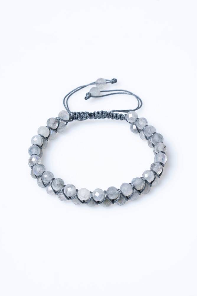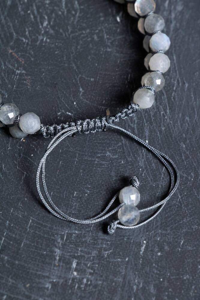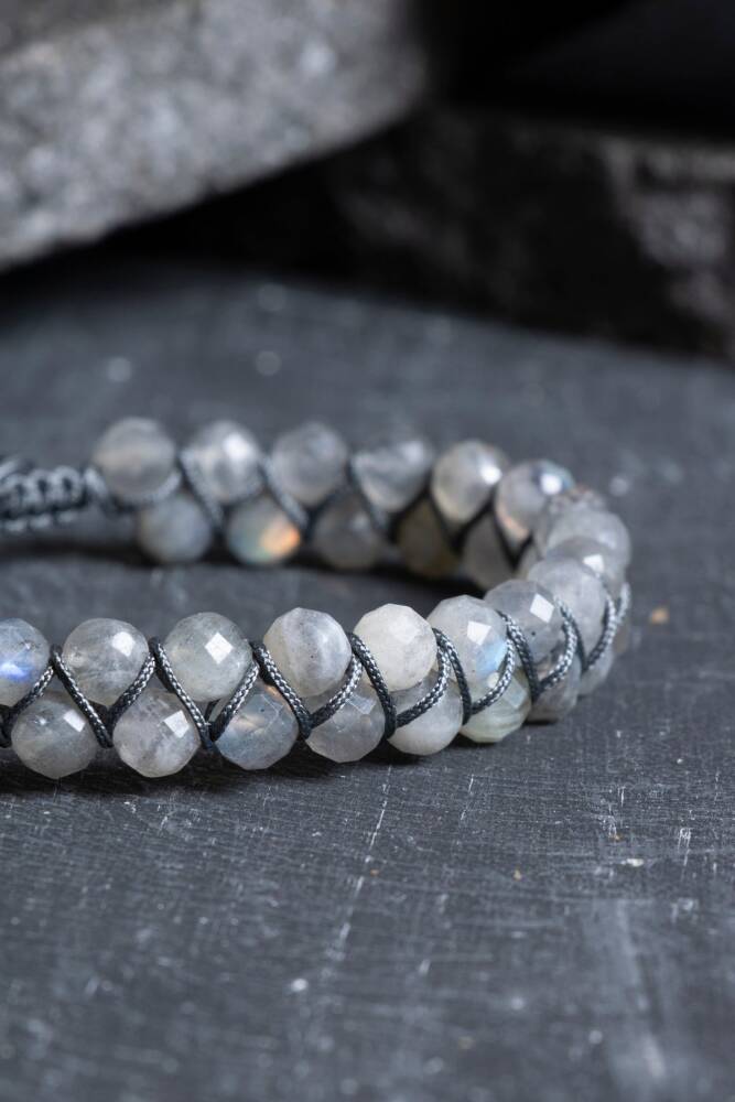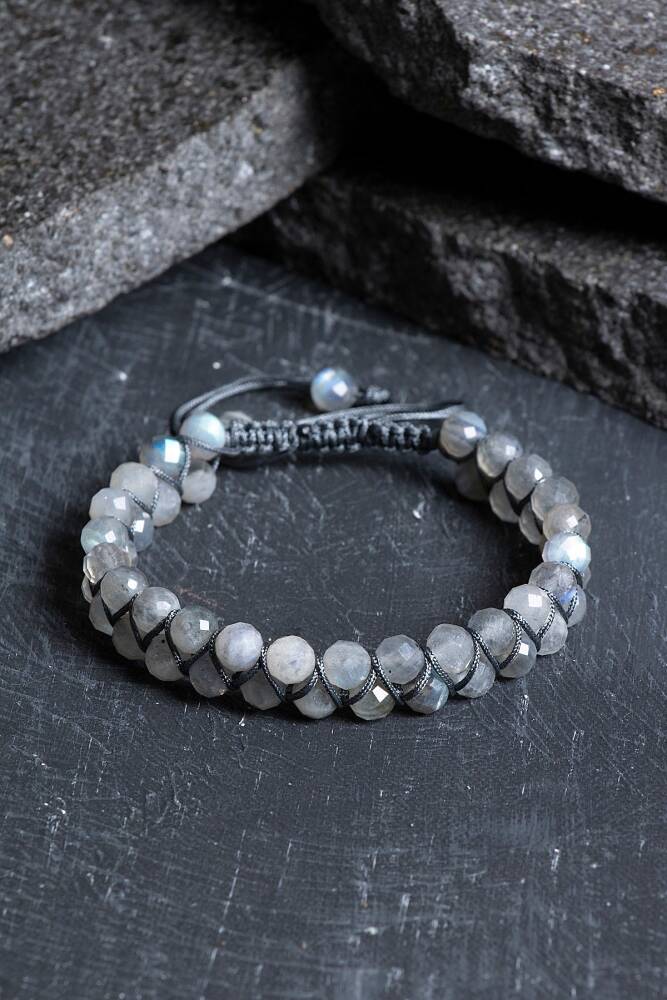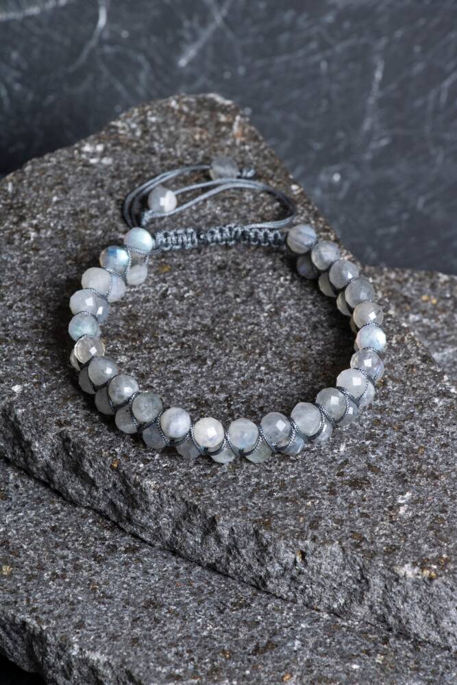 Kuzey ışıklarının yeryüzündeki yansıması olarak kabul edilen Labradorit, çift sıra taş dizimi ve titiz makrome örgüyle bu özel tasarımda hayat buldu. İlk bakışta koyu tonlarda görünen ancak ışıkla buluştuğunda mavi, yeşil ve altın sarısı yansımalar (labradoresans) sunan bu taş, el emeği düğümlerle birleşerek büyüleyici bir şıklık sunuyor.