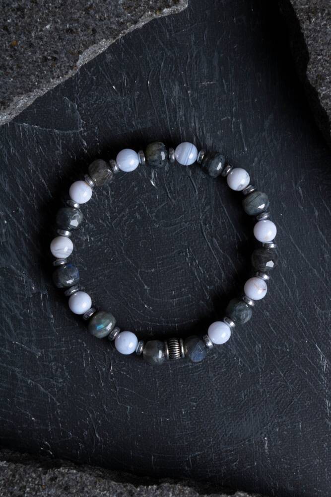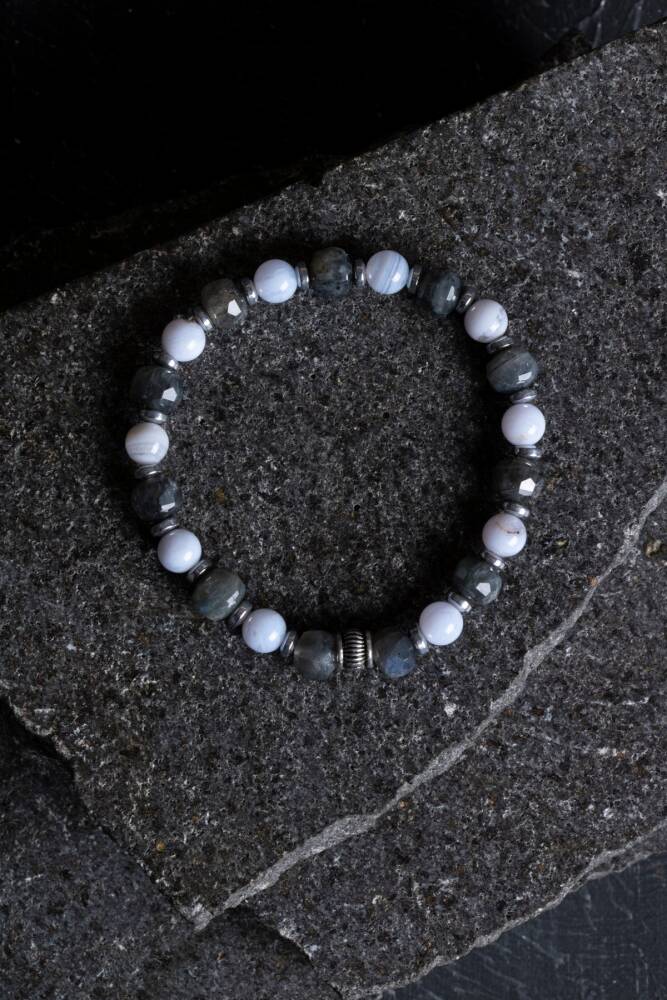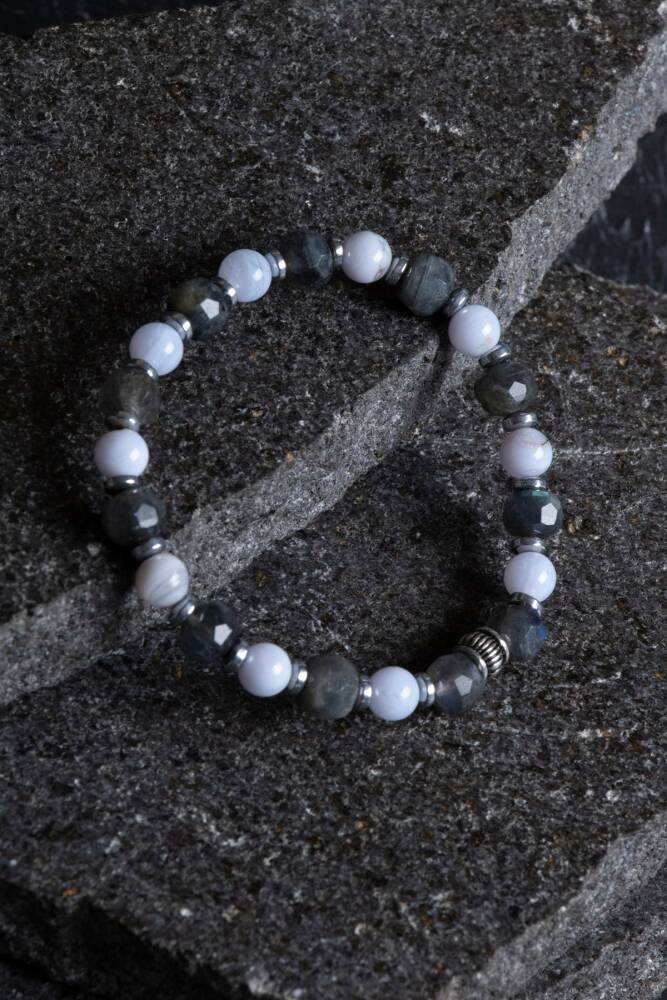 Eşsiz Görsel Şölen: Labradorit’in gizemli ışık oyunları ve Kalsedon’un yumuşak dokusu, bileğinizde sofistike ve asil bir duruş sergiler.