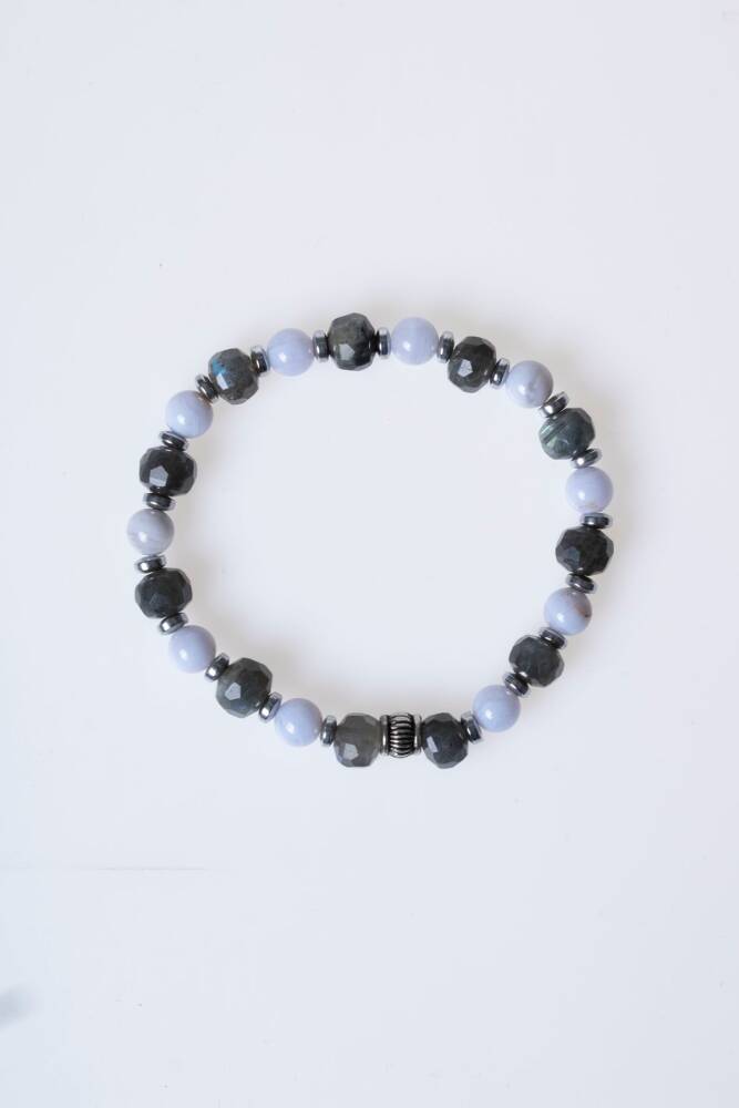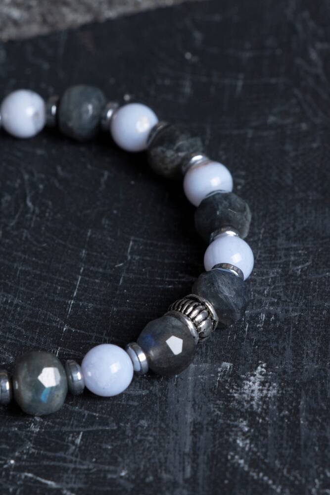 Işığın taşı Labradorit, huzurun simgesi Kalsedon ve topraklanmanın gücü Hematit, usta ellerde tasarlanan bu özel bileklikte buluştu. Bu tasarım; hem mistik yansımalarıyla göz kamaştıran bir estetik sunar hem de gün boyu sizi negatif etkilerden koruyarak zihinsel berraklık sağlayan ruhsal bir rehber görevi görür.