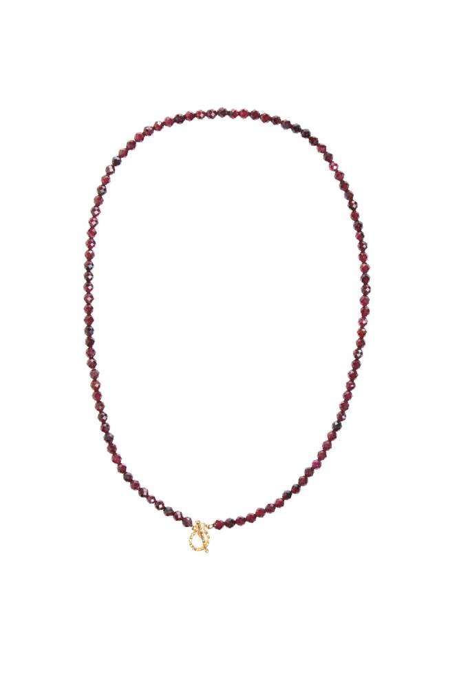 Her detayı özenle hazırlanmış bu kolye, sertifikalı doğal taş içeriğiyle kalitesini kanıtlar. 4 mm'lik fasetli granat taşları, altın kaplama ara detaylarla birleşerek zarif ve dikkat çekici bir görünüm sunar.