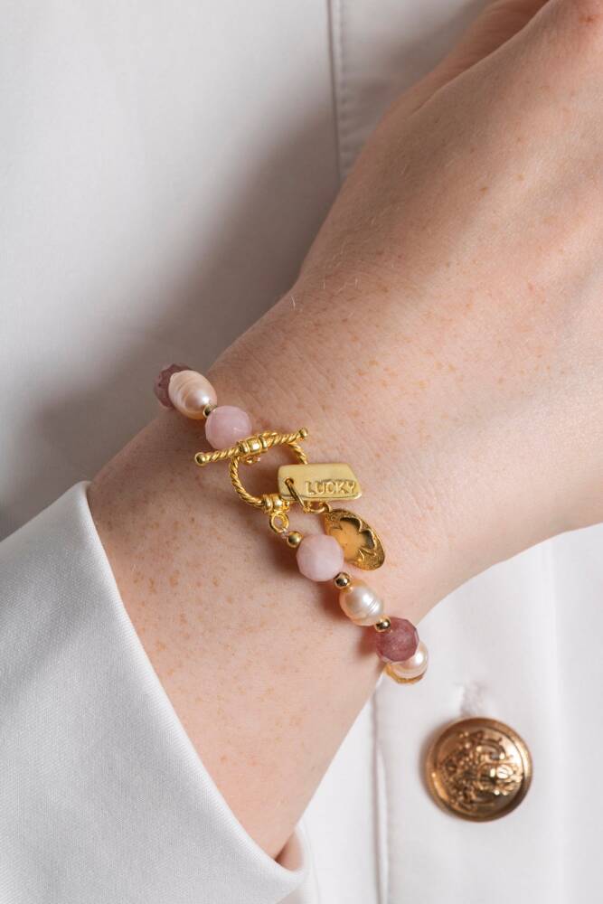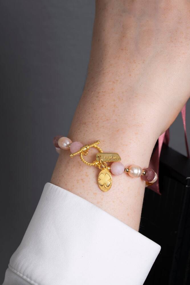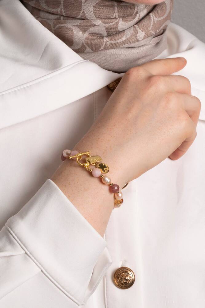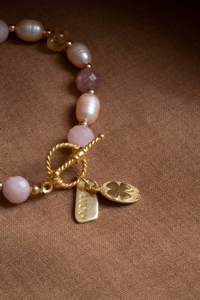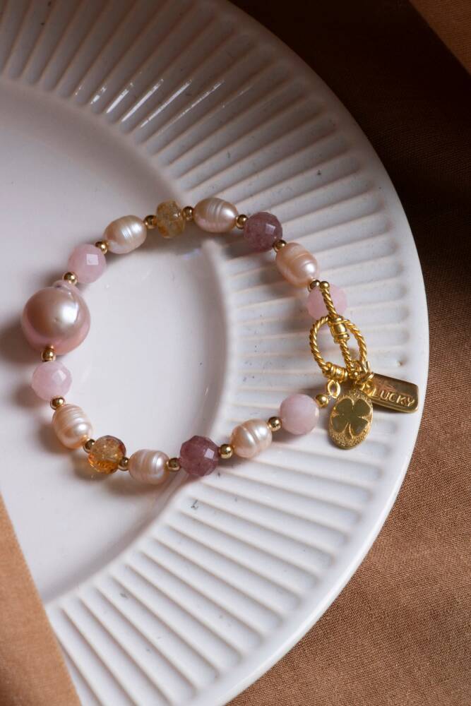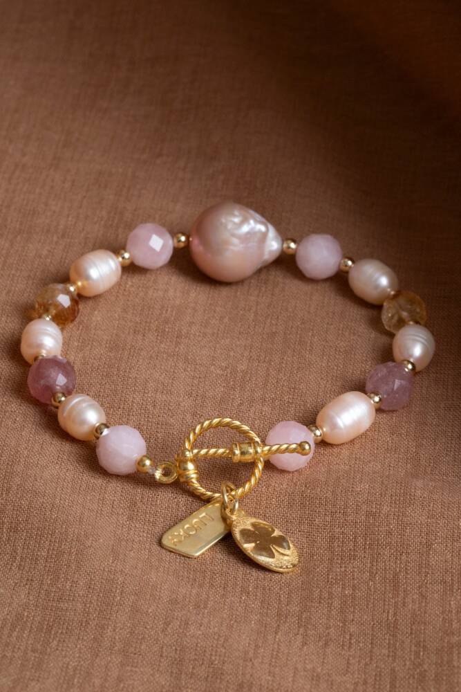 Mai Bileklik: Barok İnci, Sitrin, Pembe Kuvars, Çilek Kuvars Gümüş Charm ve Aparatlı Doğal Taş Bileklik