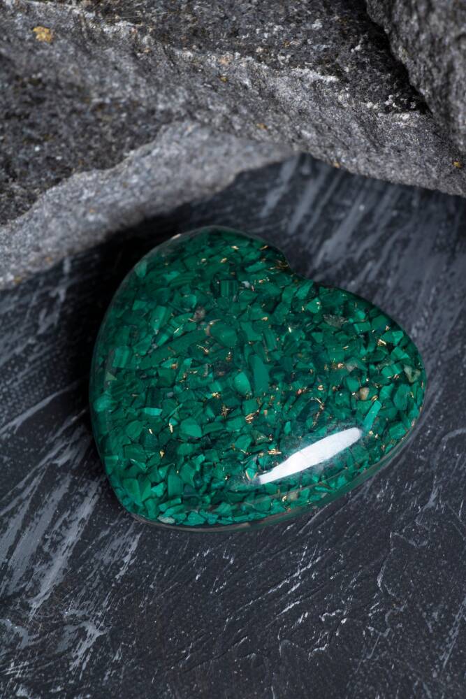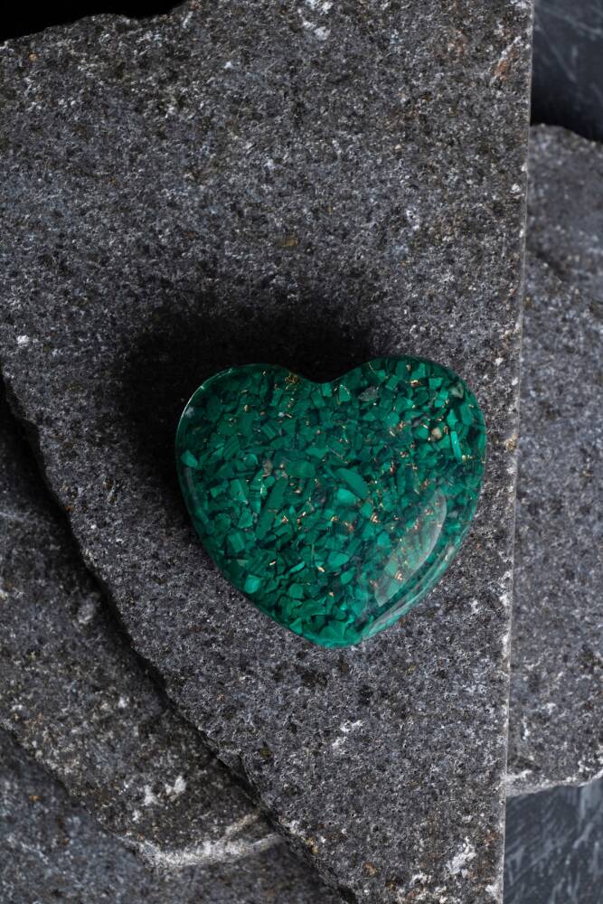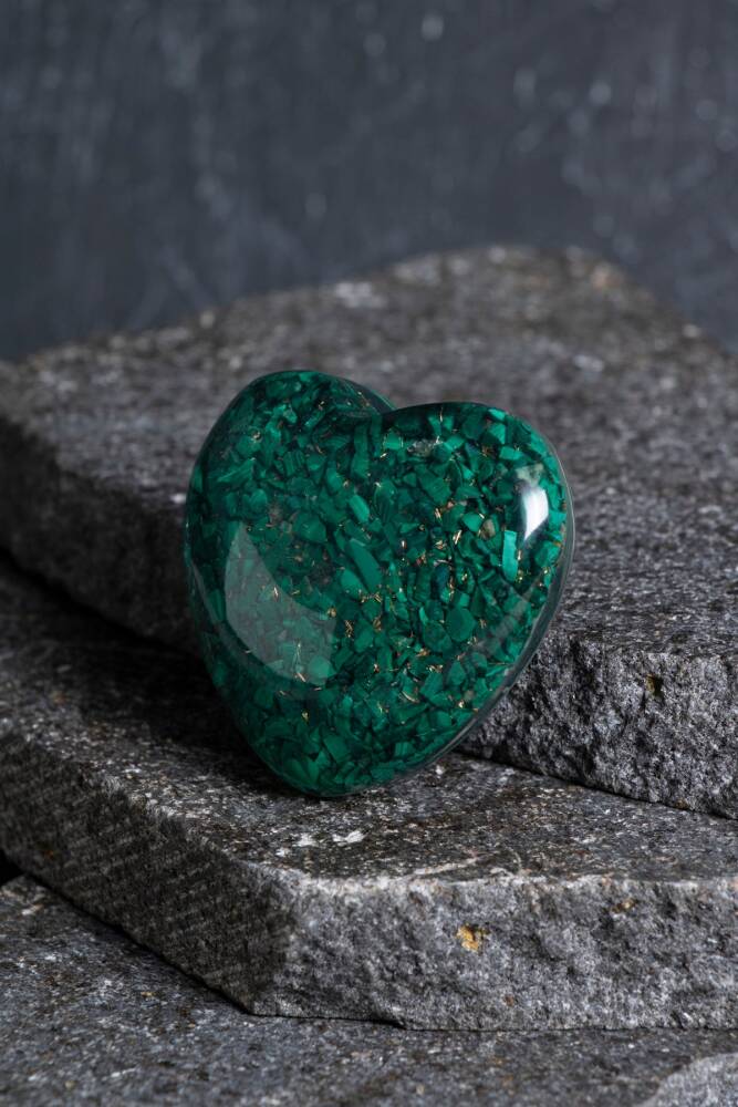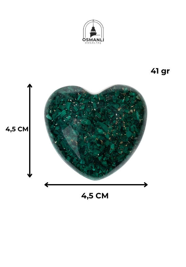 - Doğanın özünü yansıtan Malahit kalp, doğal taşın eşsiz güzelliğini ve huzur veren enerjisini evinize getirir. - Her bir Malahit kalp, tek parça olarak özenle işlenmiş olup, benzersiz ve otantik bir tasarıma sahiptir. - Türkiye'de üretilen bu ürün, yerel zanaatkarların el emeğiyle şekillendirilmiştir ve kalite standartlarına uygun olarak hazırlanmıştır. - Doğal taş kullanımı sayesinde her bir kalp, kendine has desenler ve renk tonlarıyla görsel bir şölen sunar. Kalp objesi 44 gr'dır.