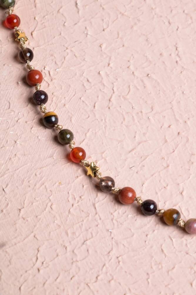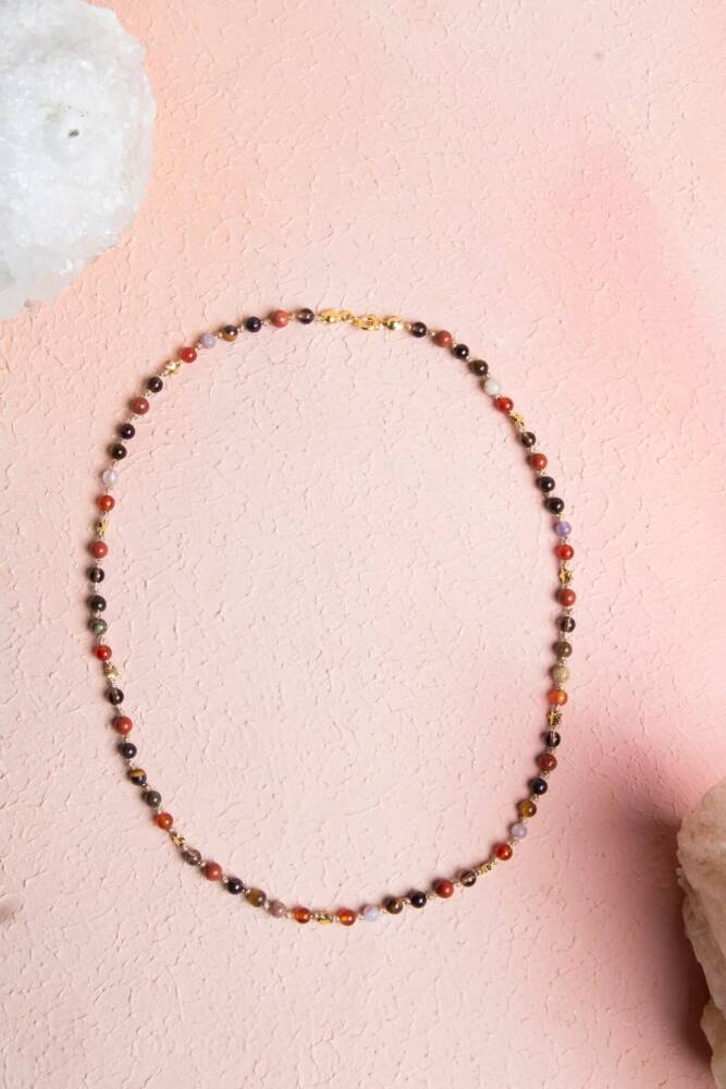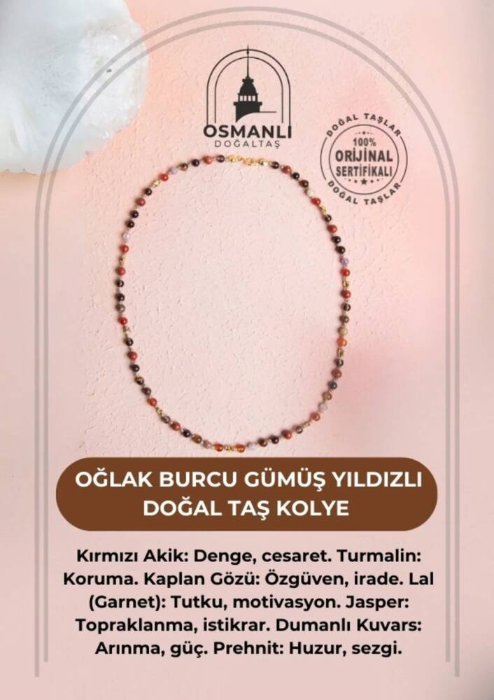 Disiplin, kararlılık ve azim... Oğlak burcunun sorumlu, sabırlı ve hedef odaklı enerjisini yansıtan bu özel gümüş yıldızlı kolye, Kırmızı Akik, Turmalin, Kaplan Gözü, Lal, Jasper, Dumanlı Kuvars ve Prehnit enerjisiyle tasarlandı. %100 doğal ve sertifikalı taşlarla özenle hazırlanan bu kolye, sabit ölçüsüyle hem ruhsal destek sağlar hem de günlük stilinize eşsiz bir dokunuş katar. Taşların Enerjisi: Kırmızı Akik: İçsel denge, cesaret ve kararlılık kazandırır. Turmalin: Negatif enerjilere karşı güçlü bir koruma kalkanı oluşturur. Kaplan Gözü: Özgüven, cesaret ve irade gücü verir; hedeflere odaklanmayı kolaylaştırır. Lal (Garnet): Tutku, canlılık ve motivasyon verir; Oğlak'ın azmini pekiştirir. Jasper: Topraklanma ve istikrar hissi sağlar; pratik düşünmeyi destekler. Dumanlı Kuvars: Negatif enerjiyi arındırır, zorluklarla başa çıkma gücü verir. Prehnit: İçsel huzur, sezgi ve ruhsal farkındalık sağlar; hedeflere ilerlerken sakin kalmaya yardımcı olur. Öne Çıkan Özellikler: %100 doğal ve sertifikalı taşlar. Oğlak burcuna özel seçilmiş güçlü taş kombinasyonu. Şık ve modern gümüş yıldız detayı. Hem enerjisel denge hem de estetik şıklık. Sabit ölçü tasarımıyla kolay kullanım. Bu kolye, sadece bir takı değil; Oğlak burcunun disiplinini, kararlılığını ve içsel gücünü taşıyan özel bir semboldür.