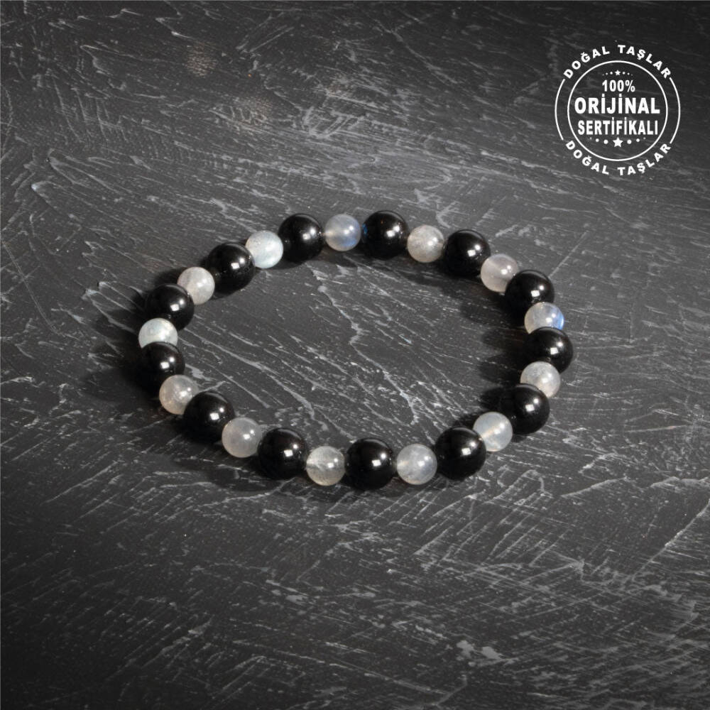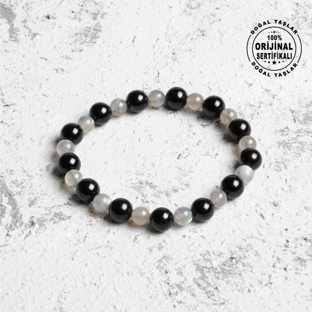 Osmanlı Doğal Taş markasının uzmanlığıyla hazırlanmış bu özel bileklik, tamamen doğal labradorit ve siyah turmalin taşlarıyla tasarlanmıştır. Labradorit taşları 6 mm, siyah turmalin taşları ise 8 mm çapında olup bileklikte uyumlu bir görsellik ve enerji sağlar. 16-21 cm arası beden seçenekleri sayesinde, bileğinizin ölçüsünü alarak en uygun bedeni sipariş edebilirsiniz. Ayrıca, bileklik orijinalliğini garanti eden sertifikası ile birlikte gönderilmekte olup, kalitenin güvencesini sunar.
