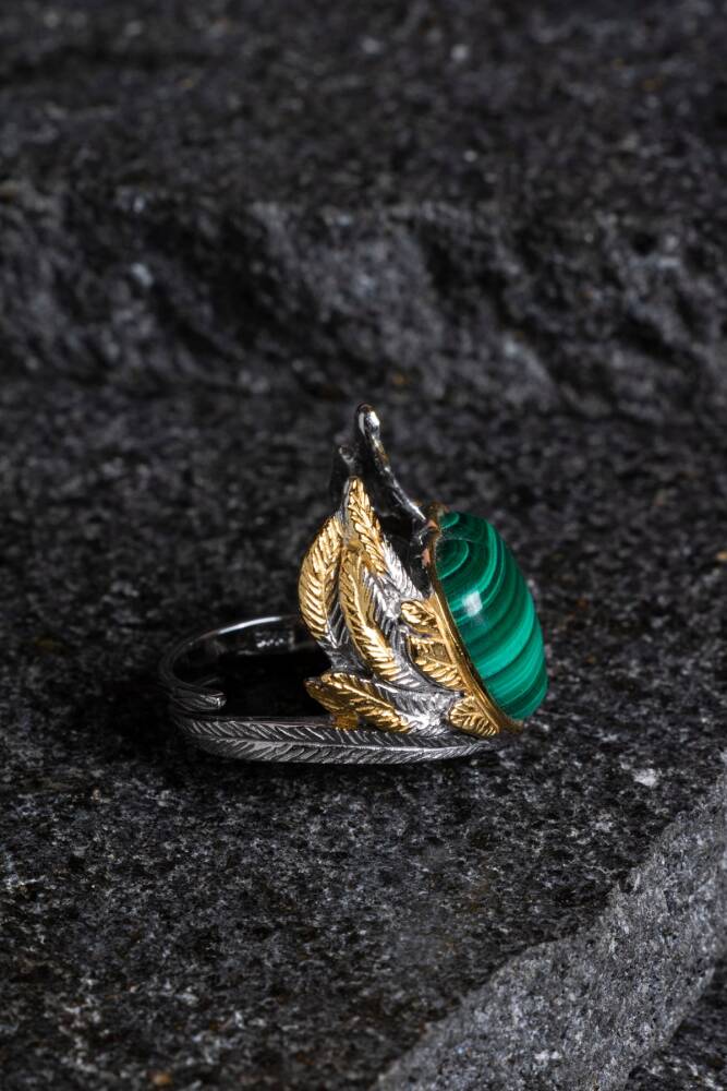 Bu yüzük, orijinalliği ve kalitesi onaylanmış Sertifikalı Malahit taşı kullanılarak üretilmiştir. Taşın canlı desenleri, İridyumlu Gümüş detaylarla birleşerek göz alıcı ve asil bir estetik sunar.