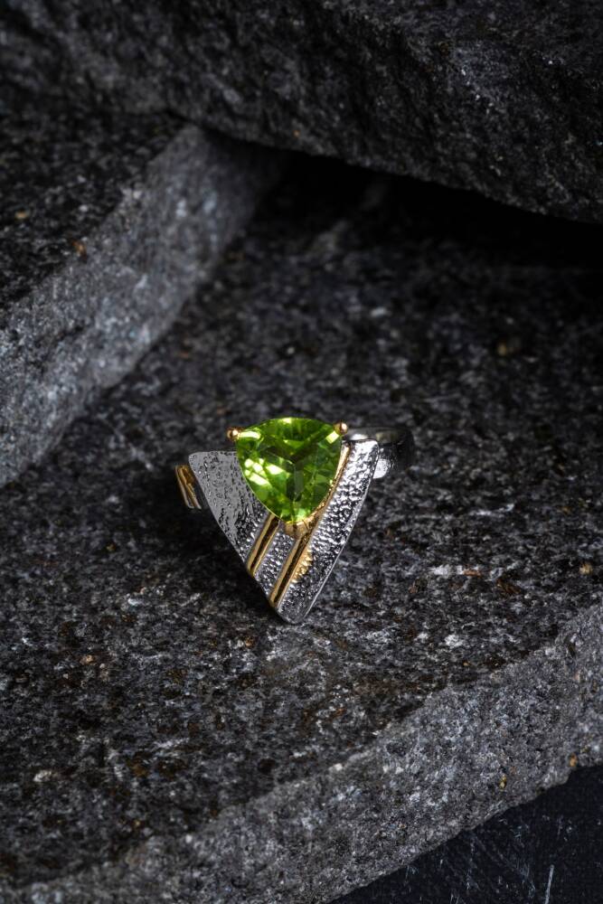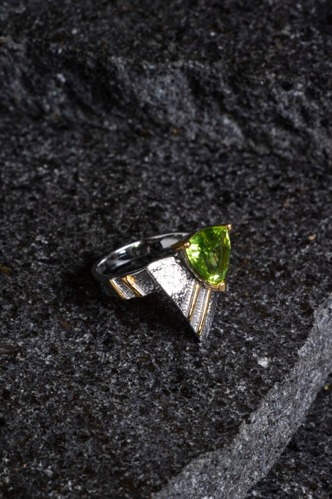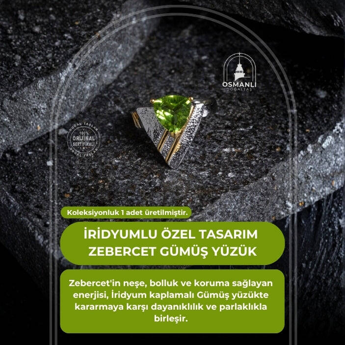 Bolluğun, neşenin ve güneşin pozitif enerjisini taşıyan Zebercet (Peridot) doğal taşının canlı yeşil ışıltısıyla tanışın. 925 Ayar Gümüş üzerine İridyum ile zenginleştirilmiş özel tasarımıyla bu yüzük, hem çarpıcı bir estetiğe hem de pozitif enerji ve koruma sağlayan değerli bir objedir.