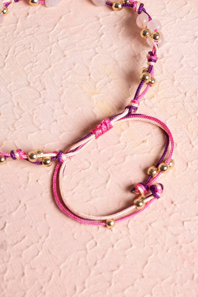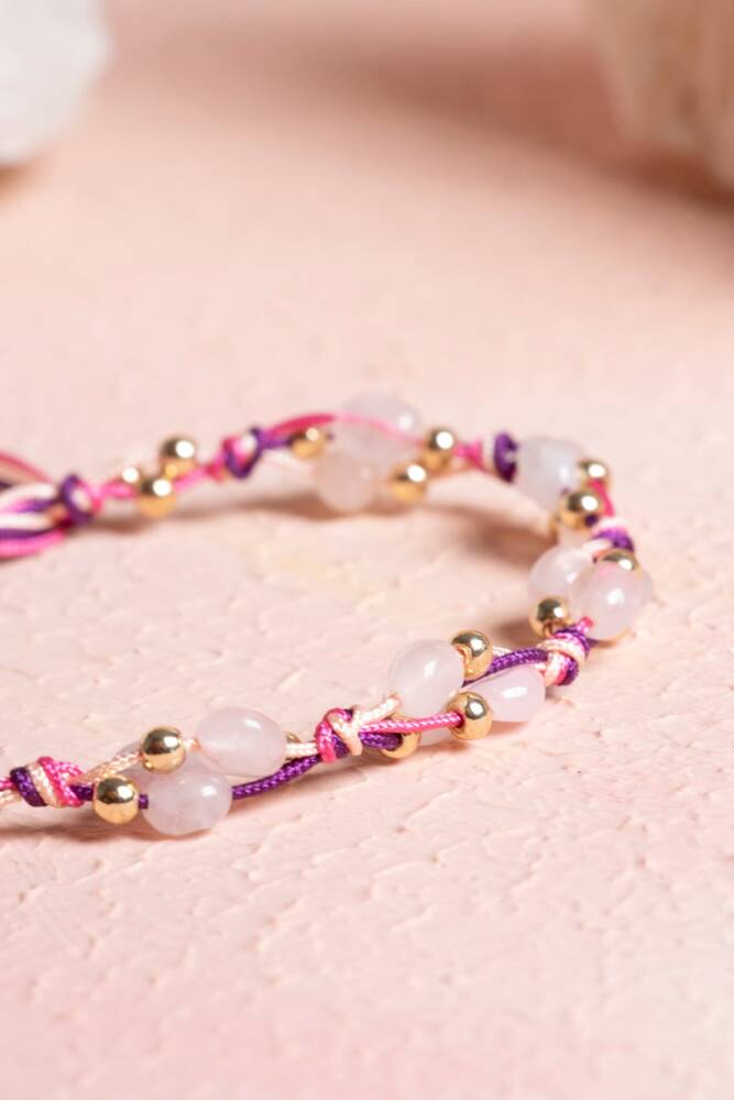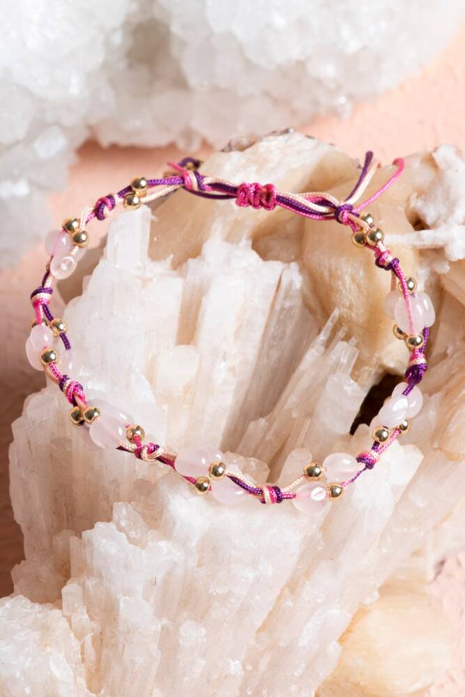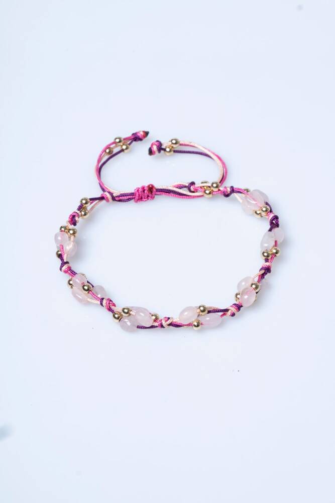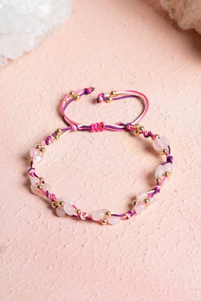 'Aşk Taşı' olarak bilinen Pembe Kuvars ve 'Güç Taşı' olarak bilinen Hematit, usta ellerde düğüm düğüm işlenen makrome sanatıyla bir araya geldi. Bu bileklik, sadece şık bir aksesuar değil; ruhunuzu sevgiye açarken zihninizi dinginleştiren, sizi hem duygusal hem de fiziksel olarak dengeleyen bir enerji sembolüdür.