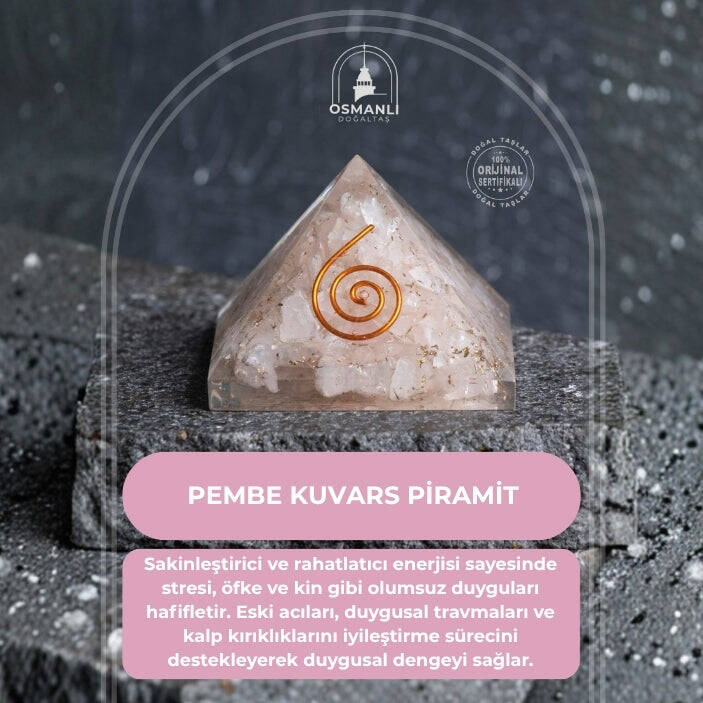 Sertifikalı Pembe Kuvars Piramit , evrensel sevginin, şefkatin ve duygusal rahatlığın kristalize olmuş formülüdür. Mistik piramit geometrisi sayesinde, Pembe Kuvars'ın nazik enerjisi yaşam alanına odaklanmış ve güçlü bir şekilde izin veriyor.