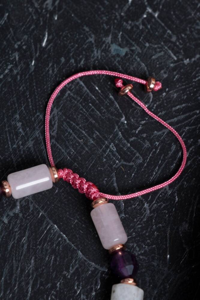 Bu özel bileklik, sakinleştirici pembe kuvars ve dengeleyici hematit taşlarının birleşimiyle tasarlandı.