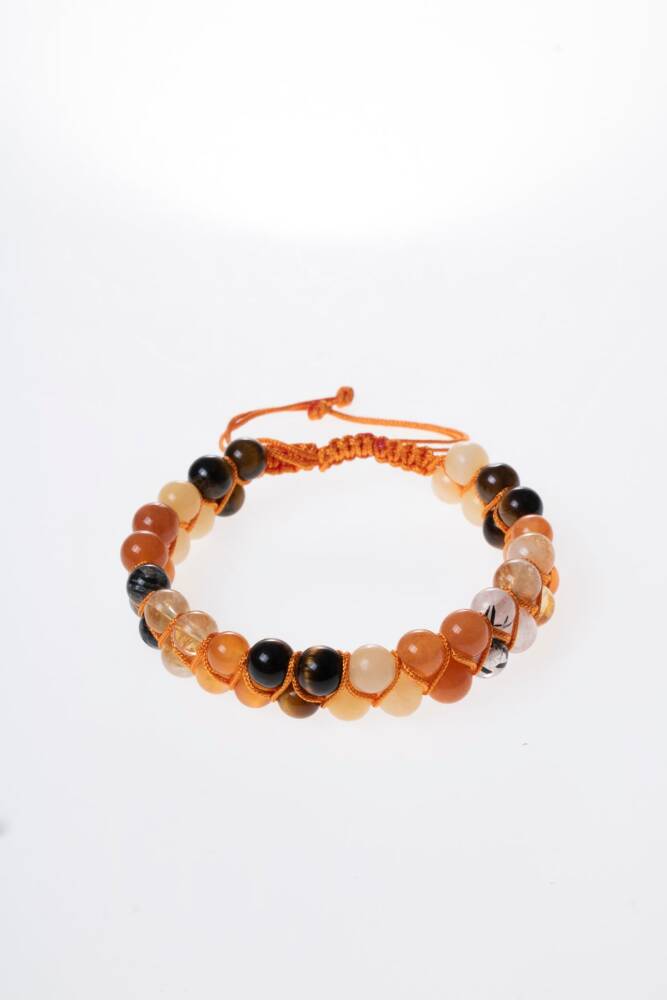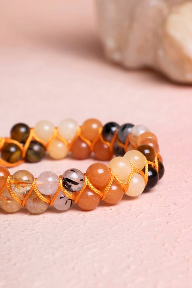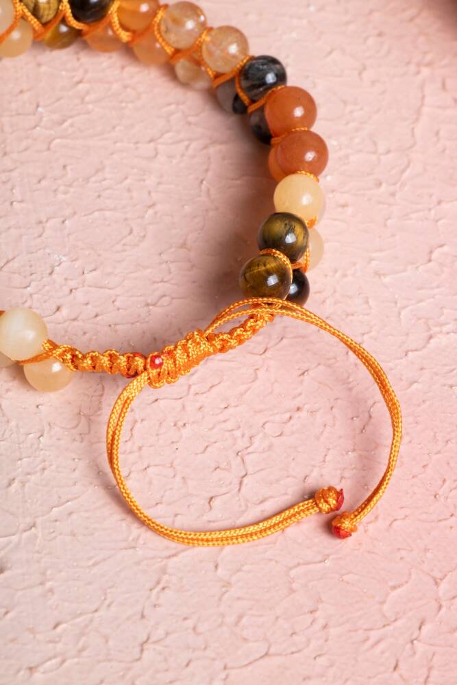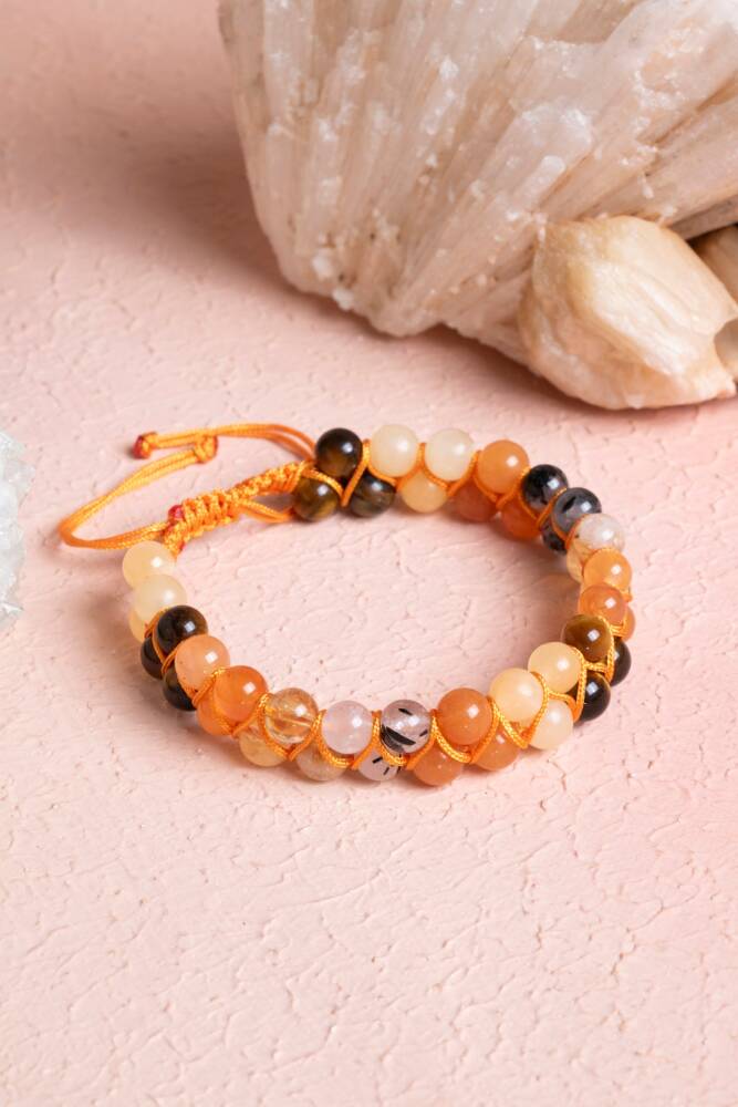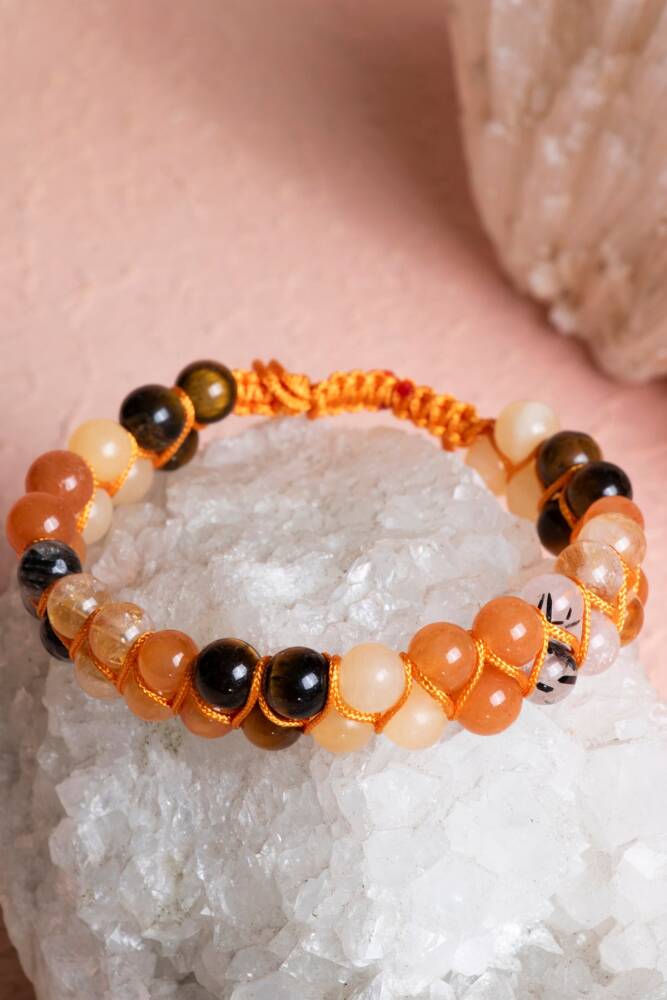 Bileklik, yaşam sevincini, duyusal zevki ve yaratıcılığı destekleyen %100 doğal ve sertifikalı Kaplan Gözü, Kalsit, Turuncu Aventurin, Rutilli Kuvars, Sitrin, Karnelyan ve Akik (6mm) taşları ile elde örüldü. Bu taşların birleşimi, duygusal tıkanıklıkları gidermenize ve hayatınıza daha fazla tutku katmanıza yardımcı olur.