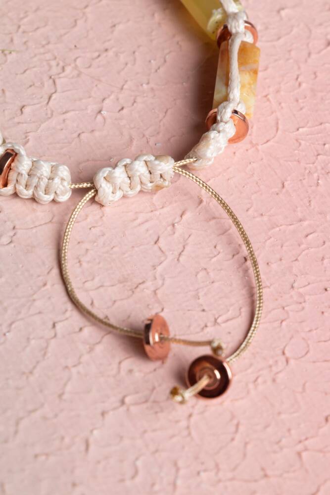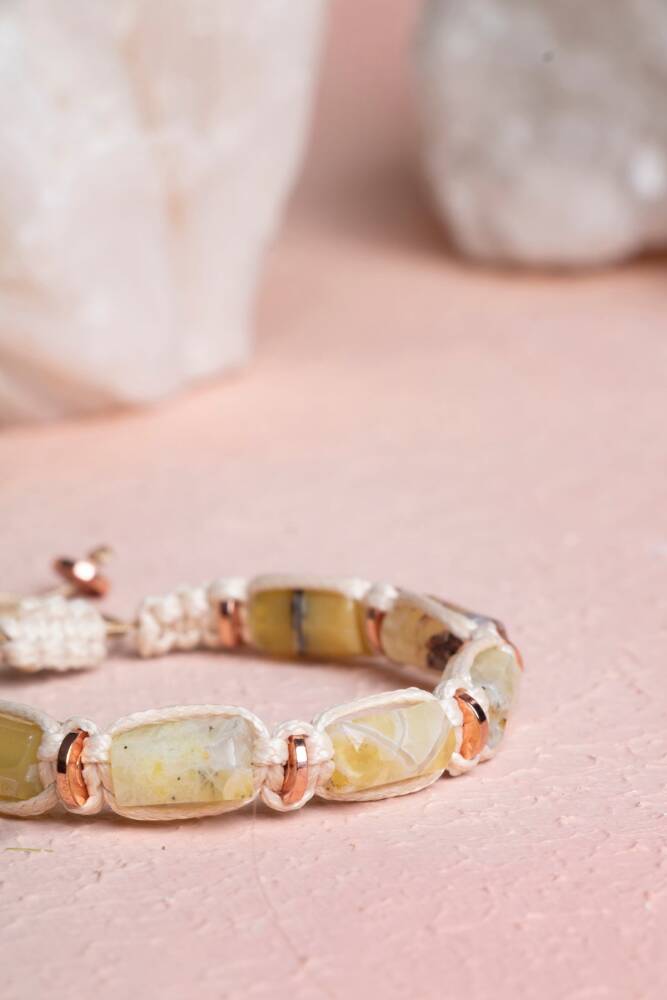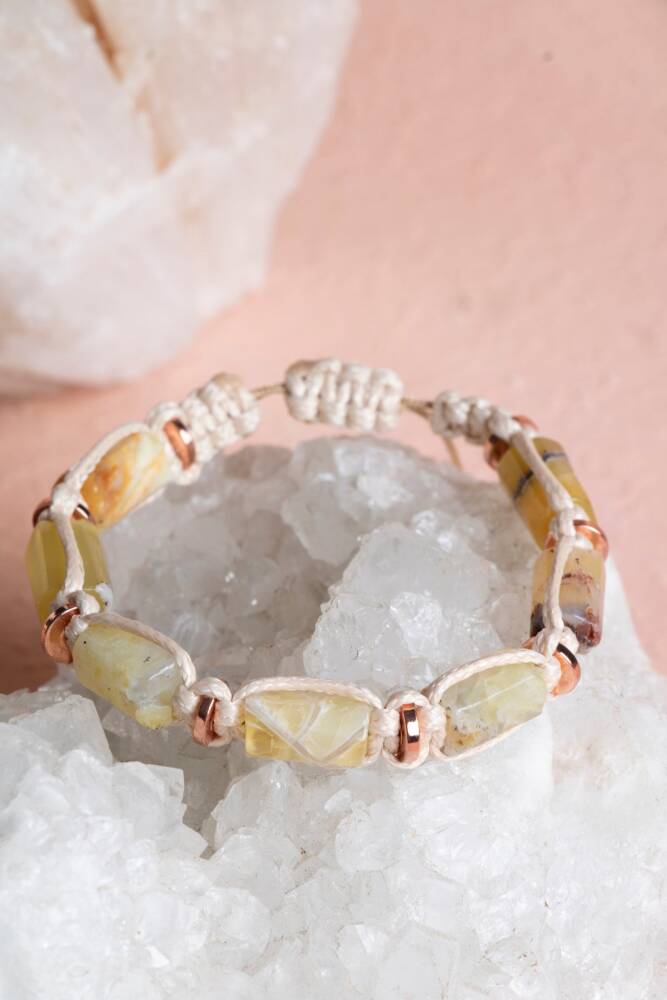 Sarı Opal’in canlılık ve neşe veren enerjisi ile Hematit’in koruyucu gücü, zarif bir makrome bileklikte buluşuyor. El işçiliğiyle hazırlanan bu özel tasarım, %100 doğal ve sertifikalı taşlarla hem ruhunuza güç katar hem de günlük stilinize modern bir dokunuş ekler.