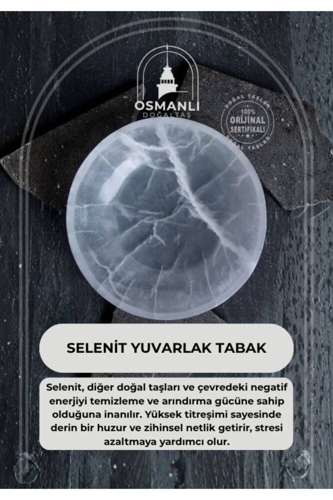 Türkiye menşeli, doğal taş materyali ile üretilmiş Selenit yuvarlak tabak, doğanın saf güzelliğini evinize getirir. - Tek parça halinde sunulan bu ürün, minimalist ve şık tasarımıyla dekorasyonunuza zarif bir dokunuş ekler. - Doğal taşın eşsiz dokusu ve özgün deseni ile her bir tabak, benzersiz bir estetik sunar. - Selenit yuvarlak tabak, doğa temalı dekorasyonunuzu tamamlayarak mekanınıza huzur ve dinginlik katar. Güçlü Enerji Temizleyici: Selenit, kendi kendini temizleyebilmesi ve başka hiçbir taşın yapamadığı şekilde diğer taşların üzerindeki negatif enerjiyi arındırmasıyla bilinir. Takılarınızı, kristallerinizi ve küçük objelerinizi bu tabağın üzerine koyarak şarj edebilirsiniz. Ruhsal Berraklık ve Bağlantı: Selenit, Taç Çakrası ile güçlü bir bağlantı kurar. Zihni berraklaştırır, ruhsal rehberlikle iletişimi kolaylaştırır ve derin bir huzur hissi sağlar. Negatif Enerji Kalkanı: Bulunduğu ortamın enerjisini yükseltir ve temizler. Mekanınızda huzurlu ve pozitif bir atmosfer yaratılmasına yardımcı olur. Yuvarlak Formun Dengeleyici Etkisi: Yuvarlak şekil, evreni ve sonsuzluğu simgeler. Enerjinin tabağın her noktasından dengeli bir şekilde akmasını sağlayarak sürekli bir şarj döngüsü yaratır.