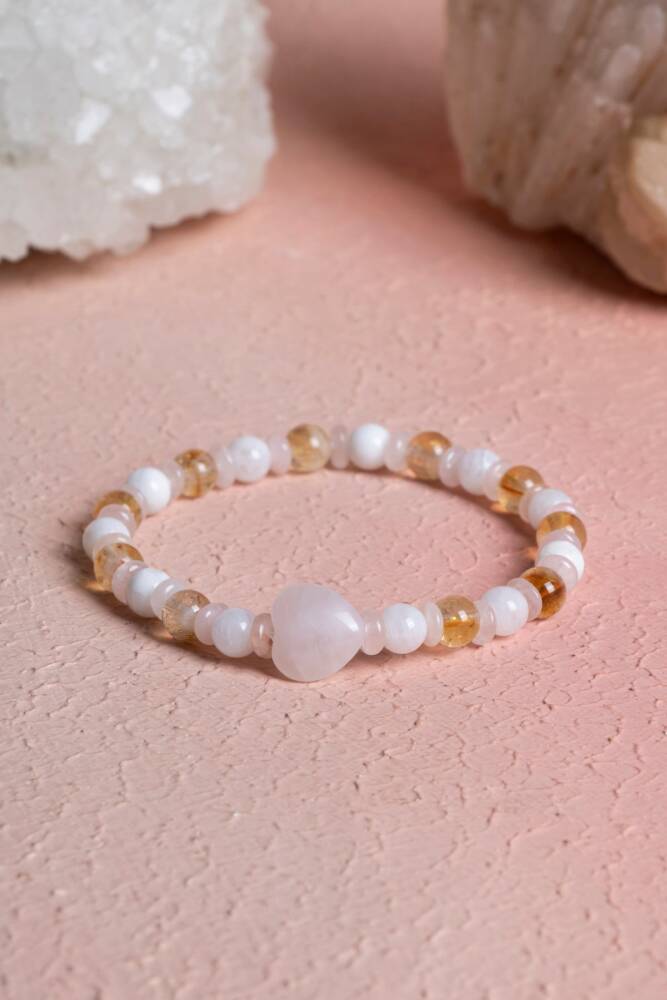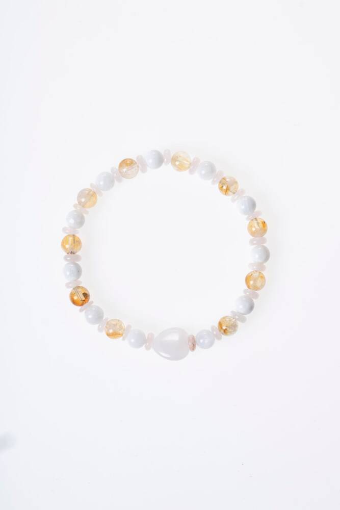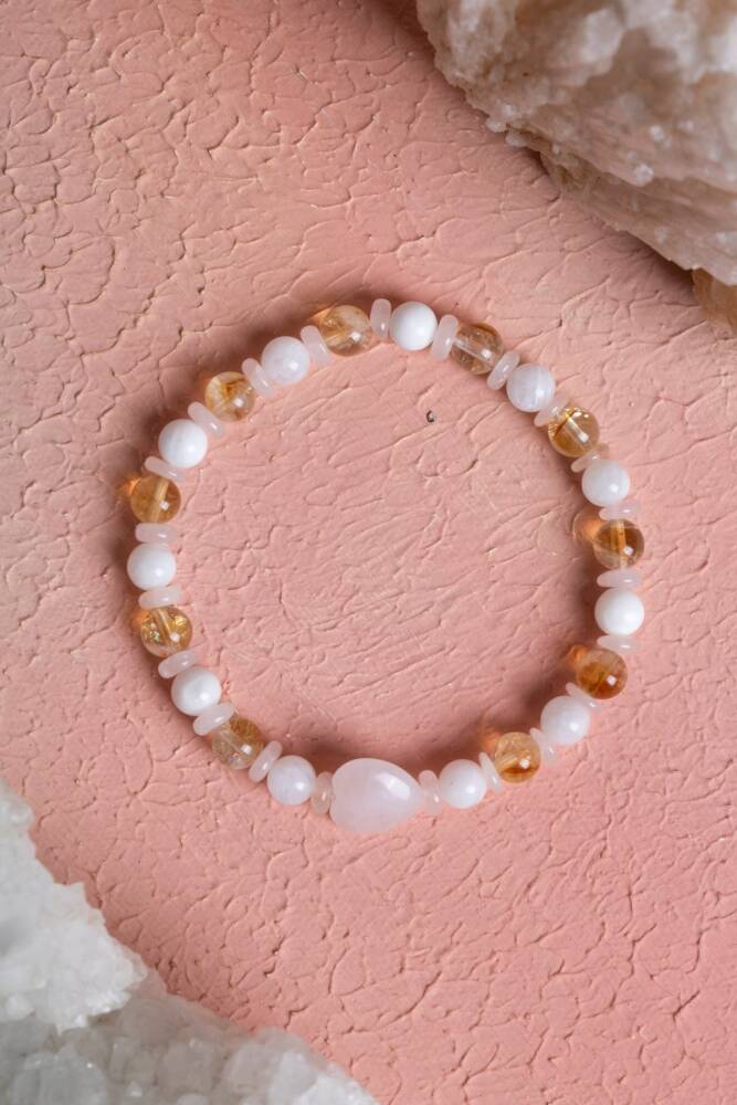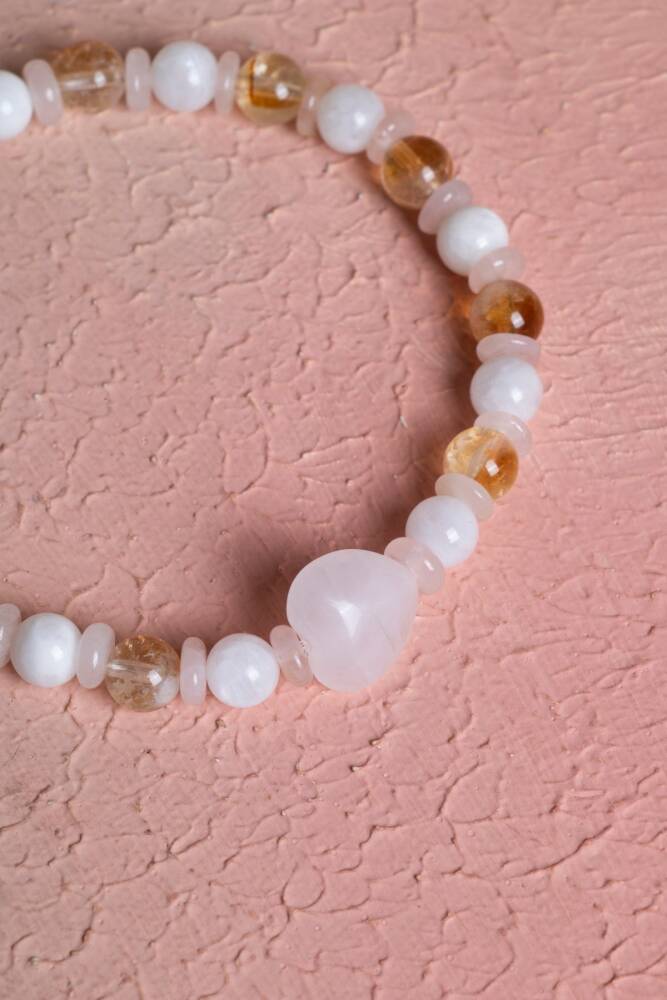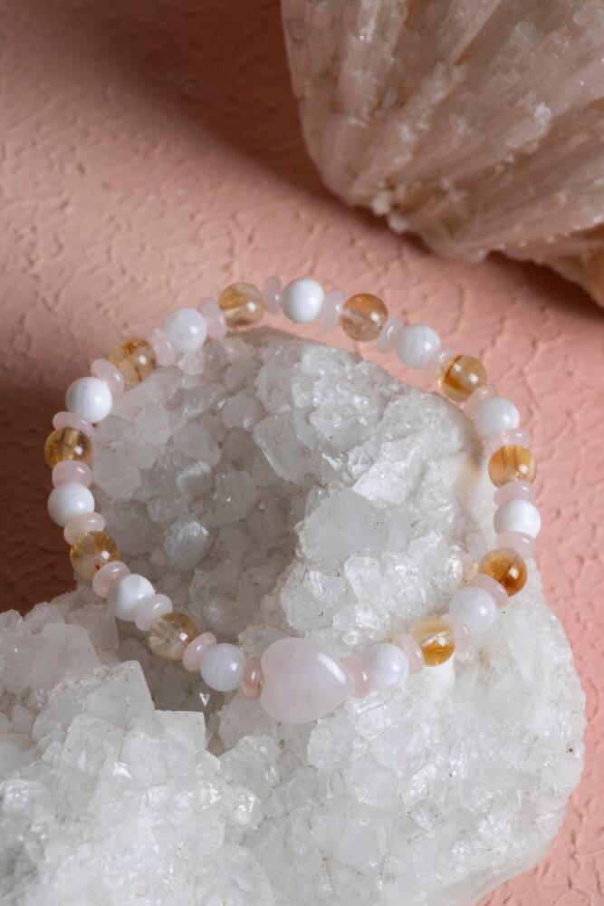 Sitrin, Ay Taşı ve Pembe Kuvars Doğal Taş Bileklik Bolluk, duygusal denge ve sevginin ışığıyla parlayın. Doğanın en uyumlu ve yüksek frekanslı üç kristali olan Sitrin, Ay Taşı ve Pembe Kuvars, bu özel tasarımda bir araya geldi. Hayatına pozitif enerjiyi, huzuru ve bolluğu çekmek isteyenler için esnek misinalı yapısıyla günlük kullanıma uygun, zarif bir enerji eşlikçisi. Bu Özel Kombinasyonun Enerjisi Sitrin (Başarı ve Bolluk): 'Tüccar Taşı' olarak bilinir. Pozitif enerjiyi artırır, zihinsel netlik sağlar ve başarıyı hayatınıza çeker. Neşeli sarı tonlarıyla yaşama sevincini canlandırır. Ay Taşı (Duygusal Denge ve Dişil Enerji): Duygusal dalgalanmaları yatıştırır ve sezgileri güçlendirir. Özellikle kadınlar için hormonal dengeyi ve içsel huzuru destekleyen çok özel bir taştır. Pembe Kuvars (Koşulsuz Sevgi ve Huzur): Kalp çakrasını açar, öz sevgi ve çevreyle olan ilişkilerde uyum sağlar. Cilt güzelliğini desteklediğine ve ruhu stresten arındırdığına inanılır. Tasarım Özellikleri Esnek Misinalı Yapı: Takıp çıkarması son derece pratiktir. Dayanıklı ve kaliteli misinası sayesinde her bilek ölçüsüne uyum sağlar ve gün boyu konforlu bir kullanım sunar. A Kalite Doğal Taşlar: Taşların en saf ve ışıltılı halleriyle hazırlanan, enerjisi yüksek bir seçkidir. Yumuşak ve Sıcak Renk Geçişleri: Sitrinin sıcak sarısı, ay taşının mistik beyazı ve pembe kuvarsın naif pembe tonları, her türlü kıyafetle uyum sağlayan pastel bir şıklık oluşturur. Neden Bu Bilekliği Seçmelisiniz? Enerji Alanınızı Temizleyin: Günlük stresin ve negatif düşüncelerin yerini huzur, sevgi ve özgüvene bırakmasına yardımcı olur. Niyetlerinizi Destekleyin: Yeni başlangıçlar, bolluk arayışı veya duygusal şifalanma niyetleri için bu üçlü kombinasyon en güçlü destekçilerden biridir. Zarif ve Anlamlı Bir Hediye: Hem görsel güzelliği hem de derin anlamıyla sevdiklerinizin ruhuna dokunacak özel bir armağan.