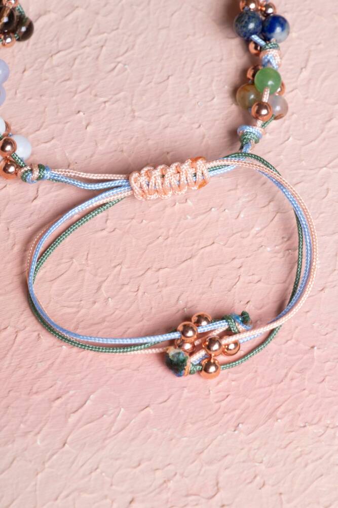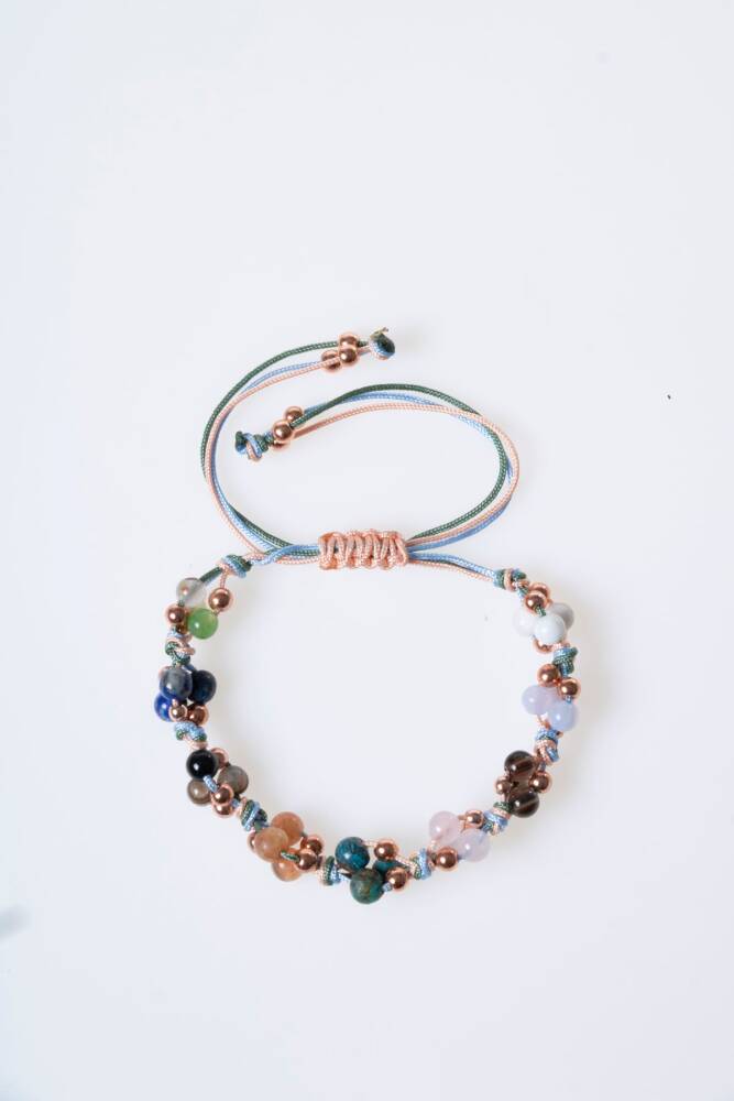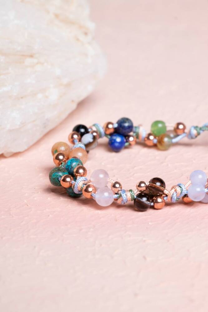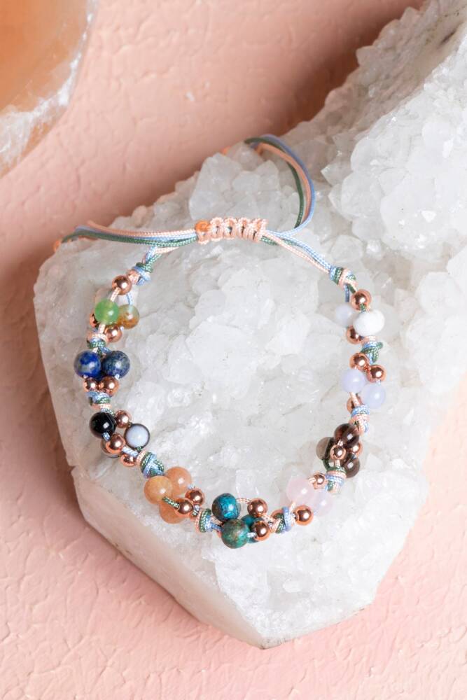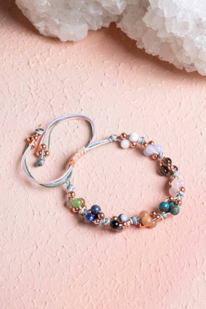 Bu özel kadın bilekliği, Terazi burcunun adalet duygusu güçlü, nazik, uyum arayan ve zarafeti seven doğasına özel doğal taşlarla tasarlandı: