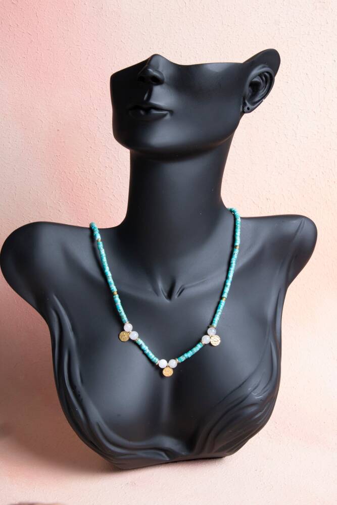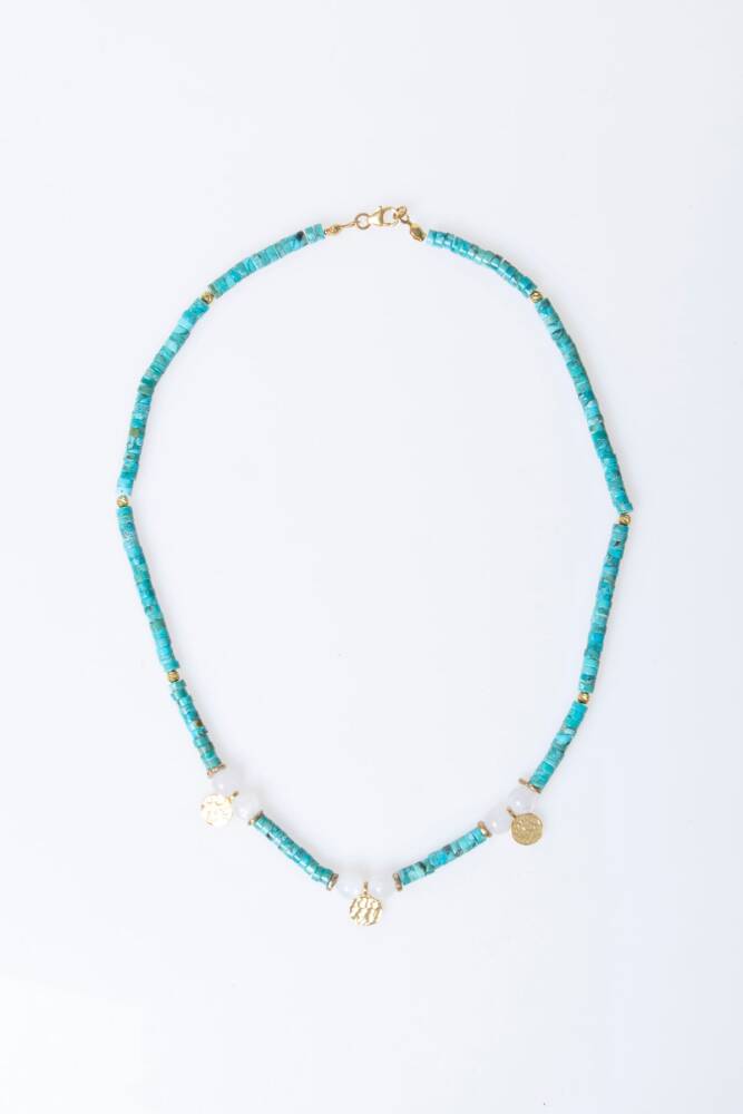 'Sadakat ve Korunma Taşı' olarak bilinen canlı Turkuaz, yüzyıllardır dişilliğin ve sezginin simgesi olan Ay Taşı ile bu eşsiz gümüş aparatlı tasarımda bir araya geldi. Bu kolye, bir yandan enerjinizi dengelerken diğer yandan gümüşün asaletini stilinize dahil eden modern bir mücevherdir.