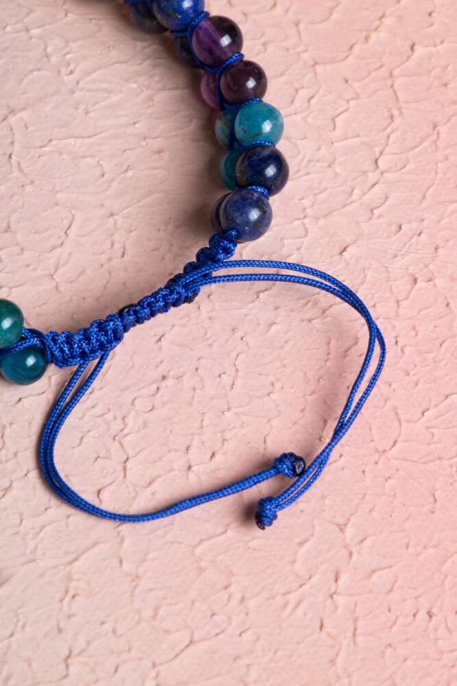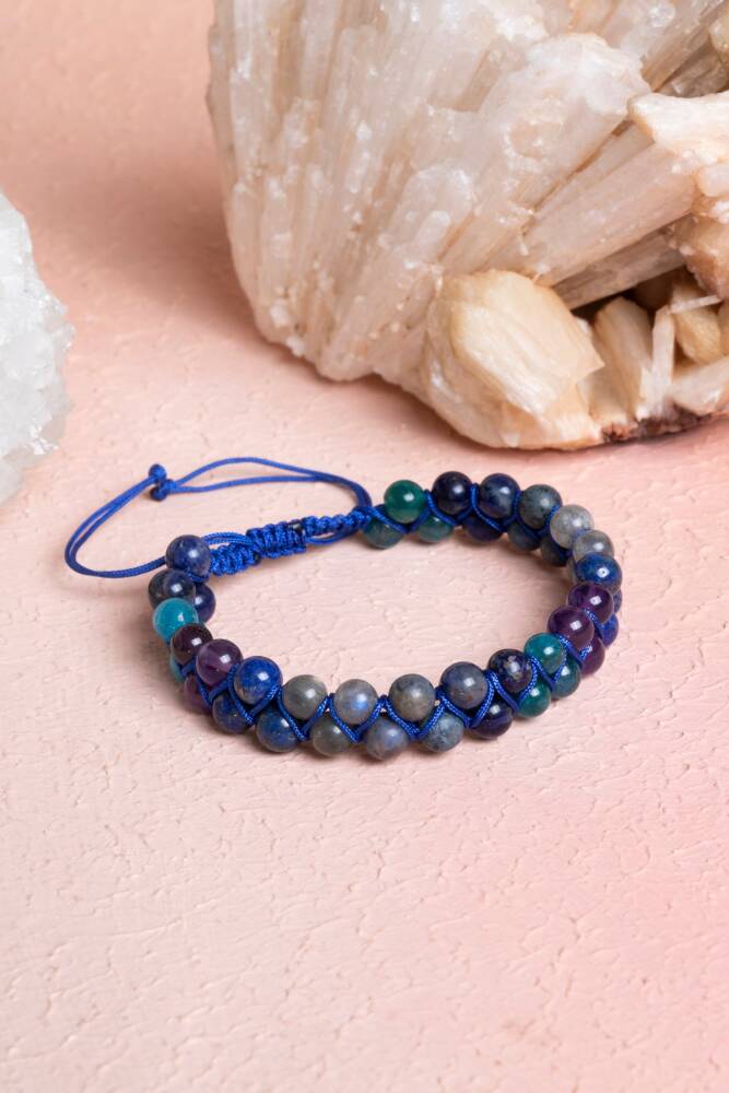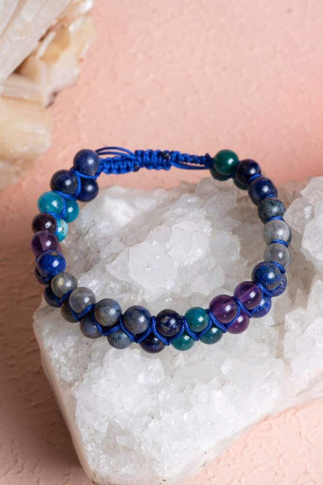 Bileklik, zihinsel netliği ve sezgisel gücü destekleyen, %100 doğal ve sertifikalı Mavi Apatit, Sodalit, Labradorit, Lapis Lazuli, Ametist ve Dumortierit taşları (6mm) ile elde örüldü. Bu taşların birleşimi, üçüncü göz çakranızı aktive ederek daha derin bir anlayış ve içsel rehberlik sağlar.