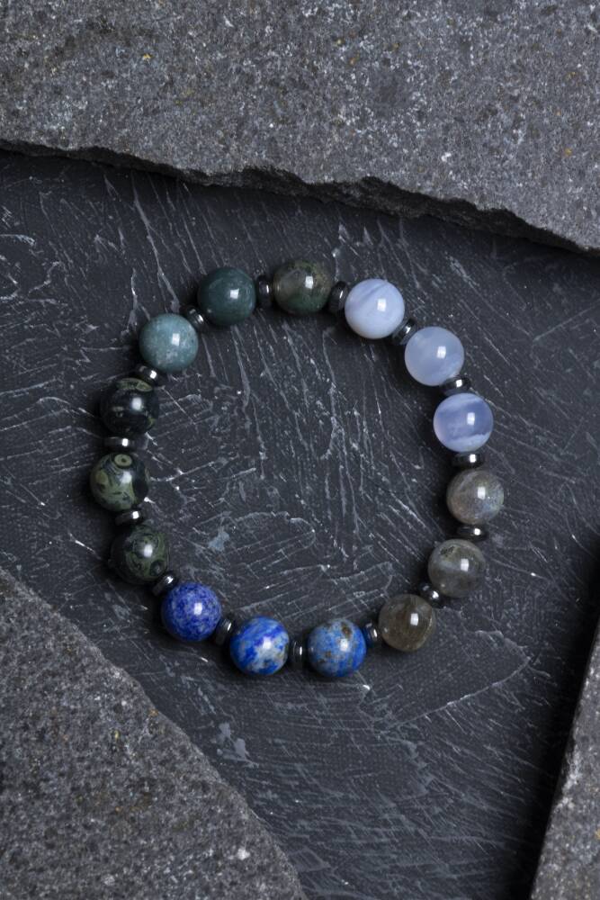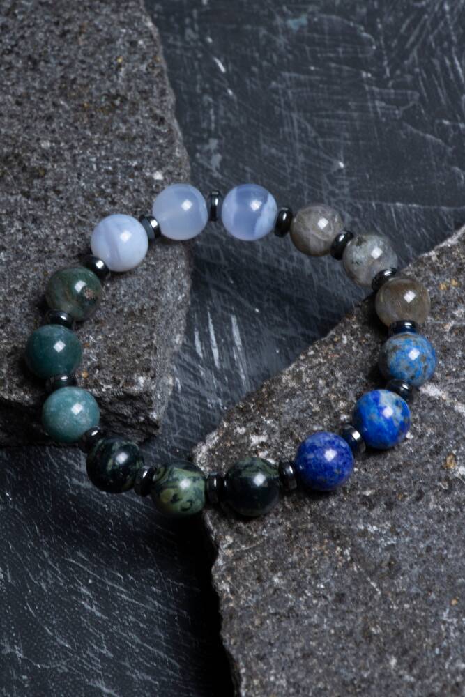 Bu özel erkek bilekliği, Yay burcunun maceracı, iyimser ve bilgiye açık yapısına hitap eden güçlü doğal taşlarla tasarlandı: