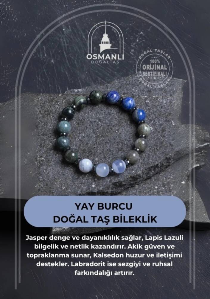 Keşif, bilgelik ve içsel güç… Yay burcunun özgür ruhunu bileğinizde taşıyın. Bu özel erkek bilekliği, Yay burcunun maceracı, iyimser ve bilgiye açık yapısına hitap eden güçlü doğal taşlarla tasarlandı: Jasper, kararlılık ve dayanıklılık sunarak enerjiyi dengeler. Lapis Lazuli, bilgelik, sezgi ve zihinsel netlik kazandırır. Akik, topraklanmayı destekler, güven verir. Kalsedon, dinginlik ve açık iletişimi teşvik eder. Labradorit, sezgileri güçlendirir ve ruhsal farkındalığı artırır. Bu taşların bir araya gelişi, Yay burcunun sınır tanımayan doğasını dengelerken, ruhsal gelişim ve zihinsel açıklık sunar. %100 doğal ve sertifikalı taşlarla hazırlanan bu bileklik, 10 mm taş boyutu ve maskülen tasarımıyla güçlü bir duruş sunar. Misinalı yapısı sayesinde bileğe kolayca uyum sağlar, konforlu ve pratik bir kullanım sağlar. ✨ Öne Çıkan Özellikler: Sertifikalı Jasper, Lapis Lazuli, Akik, Kalsedon ve Labradorit taşları Yay burcuna özel enerji: bilgelik, denge, sezgi ve keşif ruhu 10 mm doğal taşlarla güçlü ve erkeksi görünüm Misinalı yapı: konforlu, pratik ve sağlam kullanım El işçiliğiyle hazırlanmış, sade ve şık tasarım Günlük stile ve enerjisel desteğe uygun Bu bileklik; sadece bir aksesuar değil, Yay burcunun özgür, öğrenmeye açık ve ruhsal olarak büyümeye istekli doğasını taşıyan özel bir enerji parçasıdır.