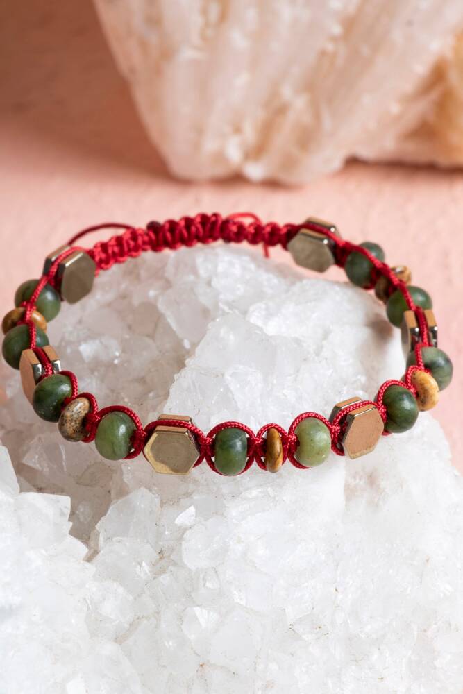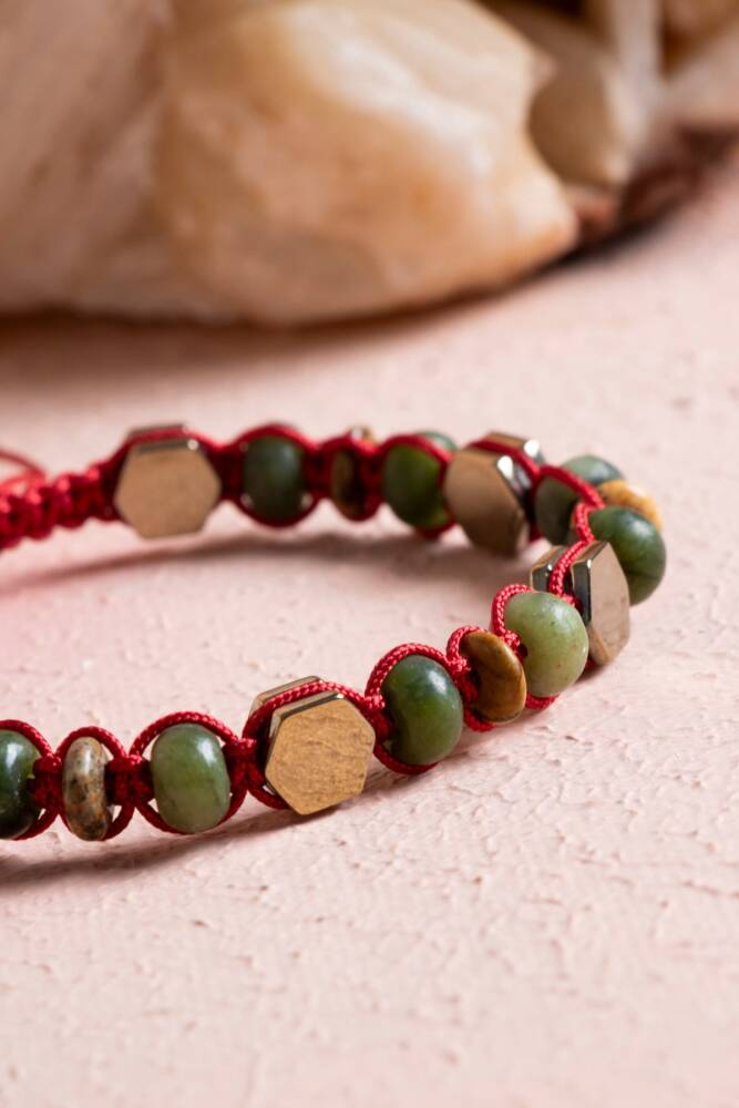 Refahı, kararlılığı ve güçlü korumayı bileğinizde birleştirin. Yeşim'in şansı, Jasper'ın topraklayıcı gücü ve Hematit'in koruyuculuğu, dayanıklı Makrome Örgü ile birleşerek bu özel bilekliği oluşturuyor. Bu sadece bir aksesuar değil, aynı zamanda günlük hayatınızda sizi destekleyen ve dengeleyen güçlü bir enerji kaynağıdır.