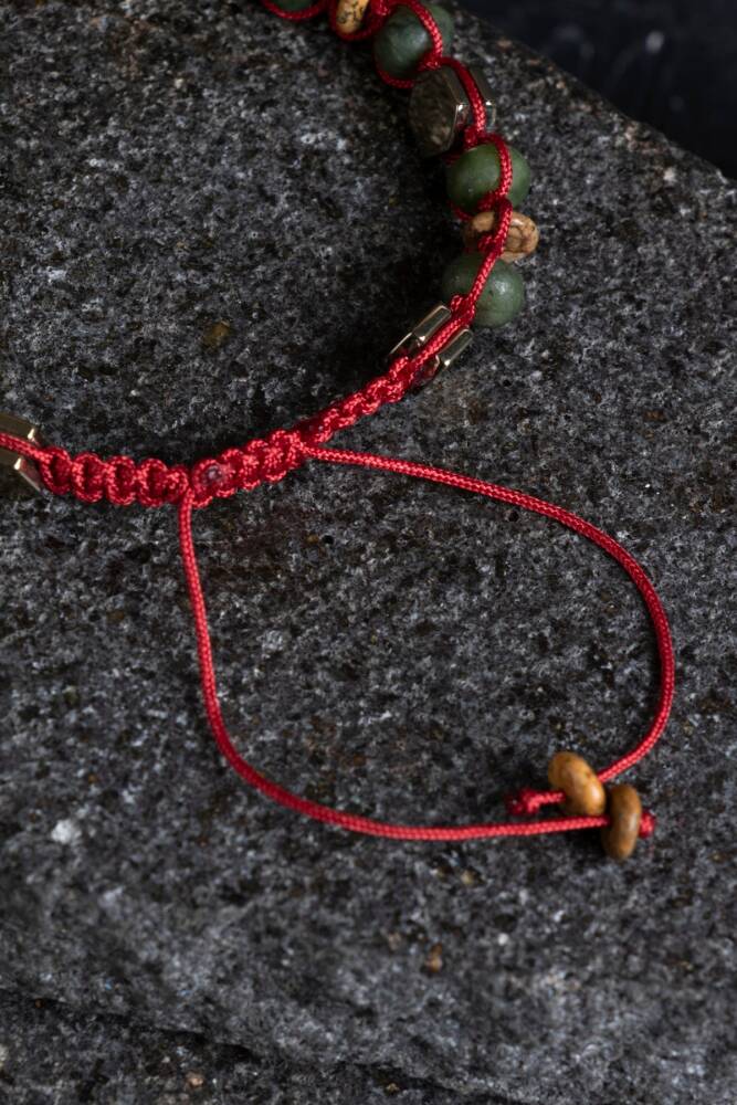 Doğanın sakinleştirici gücünü ve sarsılmaz dengesini bileğinizde taşıyın! Yeşim taşının huzuru, Odun Jasper’ın köklendirici bilgeliği ve Hematit’in koruyucu gücü, usta ellerde örülen Makrome işçiliğiyle bu özel bileklikte buluştu. Toprak tonları ve yeşilin en doğal halini yansıtan bu tasarım, ruhunuzu dinlendirmek ve zihninizi merkeze almak için hazırlandı.