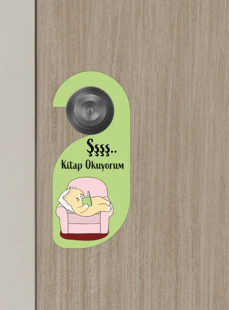 Sevimli kitap okuyan kedi illüstrasyonu ve pastel yeşil tasarımıyla bu kapı askılığı, sessizlik istediğiniz anlarda en tatlı mesajı verir. Hem dekoratif hem de işlevsel bir üründür.